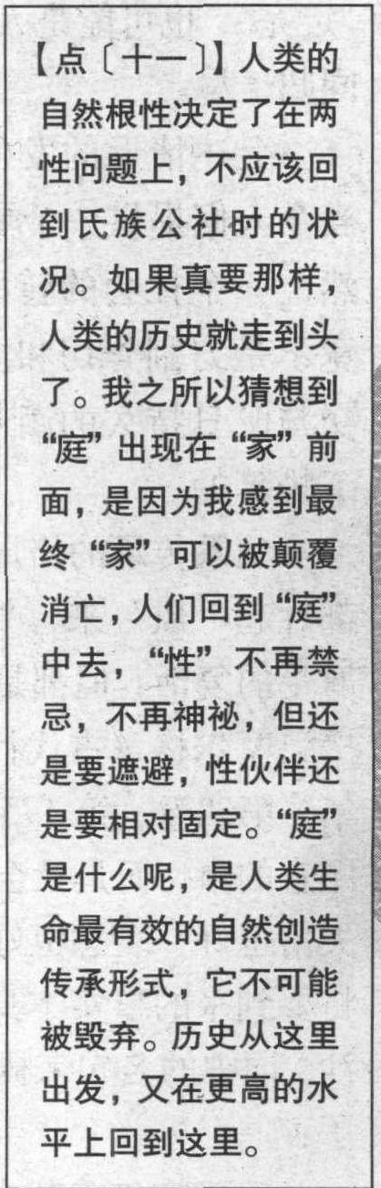释义 | 定完 父权的丧落,家庭的尾声 定完 父权的丧落,家庭的尾声(甲) (篆) 父系传承的格局一旦被打破,那个时候天下人可能都姓起 “风” 来,“这将是古代氏族的自由、平等、和博爱的复活,但都是在更高级形式上的复活。” 母系的回潮,不是人们愿意不愿意的事,而是社会经济发展的规律,你男子汉大丈夫失落也好,哀怨也好,震惊也好,愤怒也好,这些都与将要到来的事实本身毫无关系。 因社会生产力的发展、财富小有积累产生了家庭,同样,又因社会生产力高度的发展、财富高度积累,使得家庭消失(十)。历史转了一个螺旋式的大弯子,又回到母系的怀抱,这既并非异端邪说,也并非石破天惊。 “定完” 者,一定完结之谓也。这里首先应该说明的是,“定完”二字在创造时并不一定是冲着“家庭”这一具体事物而来的。相信造字者决不会具有今天的历史唯物主义常识,他不可能在那个时候就能推定 “家庭”身后的结局。但是,“定完” 二字都是由家的代行符号“宀”组构而成它的,先天的文化含义却与 “家” 有关,储存着 “家” 的信息,就像一个人的生辰 “八字”,储存着人生的信息一样。 甲骨文的 “定”,由四个部件组成: 从 “宀” (音绵),从 “一”,从 “口”,从 “止”。“宀” 在这里是家的代行符号; “一” 从古到今都用作休止符; “口” 是甲骨文 “丁” 字,“丁” 是钉与锭的初文,本是实心,由于契刻的原因契作空心,它是标示青铜器铸造前锡与铅的一种形状,“钉”、“锭” 都具有凝固、固定的含义,在这里也是 “定” 的声符; “止” 是人的一只向上的左脚形状,在这里标示人走回家里。“定” 是形声会意字。 金文的 “定”,从 “宀”,从“锭”,从“止”,与甲骨文相比只是取掉了一个休止符,仍为形声会意字。小篆的“定”,是将金文“锭”的形状讹变为一横,变作休止符,其含义不变。楷书隶定为“定”。 “定”的本意是,人从外边回到家里,不走了。以 “家” 为出发点,又以 “家” 为归宿,用休止符、凝固意来标示固定的“定”。定的引申之意有安定之意,停留之意,还有决定、肯定、规定、约定等意。在这里具有停留和肯定之意。 世间的一切事物,从出发点(家)出发,到归宿地(家)停止,作为一个过程的结束,这是普遍的规律,任何事物都无一例外,当然也包括“家庭”这一事物在内。家庭是私有制的产物,是在农业经济的土壤中成长起来的,它将在工业化、公有化和大同世界中消失,这是必然的、肯定的。这就是 “定”; 这就是 “定” 从深层次提供给我们的一种理念。 “定”也是个组字构件,从“定”所组构的汉字,都具有固定、稳定的含意: 淀: 混浊液体静态下的下沉物。 碇(椗): 固定船泊的石墩(木桩)。 靛: 一种沉淀后的蓝色染料。 腚: (屁股)一块浑圆的胴体。 绽:特指花在静态中开放貌,北周庾信《杏花》诗:“春色方盈野,枝枝绽翠英”。 完,甲骨文、金文未见,可能是那个时期人们对“完” 所形成的概念还不够完整,到小篆时才造出了个“完”字来。 小篆的 “完”,从 “宀”,从 “元”,元亦声,为形声会意字。“元” 甲骨文契作“元”,由 “儿”(音人,也是人的形象与含意)与 “二” (甲骨文、金文上字)上下结构组成。“人上” 者 “头”,“元” 是人的头部标意,具有头的含义。章士钊问毛泽东,为什么称杨开慧为“骄杨”,毛回答: “女子丧其元,焉能不骄。” 这里的“元”就是指人的头部。元首,是对头的加重语词。“元”也有开始、开头的意思,《说文》: “元,始也。” “完”,元归于 “宀” 下,无论 “元” 是开头也好,人头也罢,都具有 “完结”、“完成”、“完满”的蕴意。 “十里搭帐篷,没有不散的筵席”。任何事物,有开头,就有收尾;有出头,就有回头。当然“家”也一样,“家” 发轫于母系社会末期的农业经济土壤之中,成熟、辉煌于封建社会,以至成为封建社会政治、经济、文化的基础,为封建社会作出了贡献并登上顶峰。“家”从民主革命以后虽然逐步走了下坡,但到目前为止,仍然对社会发挥着积极的作用。它仍然有一段很长的路程需要走完。到了那个时候,它就可以向人类交出一份完满的答卷,可以自豪地宣布: “历史赋予我的使命就此完结”。 “完” 也是一个组字构件,从它所组构的汉字,都具有整体、完整的意思: 院: 用 “阝” 隔开的一个完整的处所。 浣(音换): 用 “水” 浣洗一件衣服。 莞(音管,音婉): “莞尔”是不破坏“版面”的微笑。 垸(音换): 用 “土” 挡出的一方水域。 脘: 胃内部空腔区。 皖: 古国域,地域、水域的一种称谓。 鲩: 圆转无棱角的一种鱼。 家庭的解体,是以父权的丧落为特征而开展的,它大致应该具备以下条件: 第一,一家一户作坊式的生产方式被集约式社会经济组织所代替。但它绝对不是上世纪五十到七十年代特别是一九五八年中国农村那一段历史的倒车。家庭不再是社会经济单位,男女老少在家庭以外的范围活动,男子同女子一样平等,特权对他似乎失去了缘分。 第二,社会生产力的高度发展是个决定性的因素,也是社会转型的基础。丰厚的社会财富足以使婴幼的抚养教育,病老医疗、赡养成为社会的公益事业。人们从过去对家庭在物质上、精神上、感情上的依赖和负担的圈子里解脱出来。家庭不再对社会大多数人具备极强吸引力。 第三,家庭这种社会组构形式,有碍