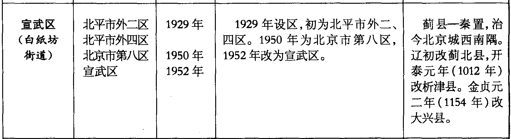 宣武区(白纸坊街道)北平市外二区北平市外四区北京市第八区宣武区1929年1950年1952年1929年设区,初为北平市外二、四区。1950年为北京市第八区,1952年改为宣武区。蓟县—秦置,治今北京城西南隅。辽初改蓟北县,开泰元年(1012年)改析津县。金贞元二年(1154年)改大兴县。