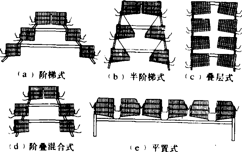 家禽笼养系统poultry cage-breeding sys-tem在笼内饲养家禽的成套机械设备。包括由禽笼组合而成的笼组、禽用喂饲设备、禽用饮水器、禽舍清粪设备和禽舍环境控制系统。笼养家禽密度高,便于管理、观察和防疫, 饲料报酬高。但按鸡位计的机械设备费用较高,对禽舍环境要求严格。 禽笼结构 由底网、顶网、前网、后网和侧网等构成。各网片用直径1.8~3.0毫米低碳钢冷拔钢丝点焊而成,表面镀锌或涂塑。冷镀锌层厚度约0.02毫米,热镀锌层厚度约0.07毫米;涂塑层厚度约0.3~0.5毫米。底网是家禽栖息和活动的底面,为了增加家禽的适舒感,应有较好的弹性。其网格尺寸既要有利鸡爪攫行,又要及时漏下禽粪。产蛋用禽笼底网有水平倾角7°~11°,以便于禽蛋滚至集蛋槽。前网以垂直钢丝为主,配以少量水平钢丝,以利家禽探头笼外采食。笼门多设在前网或前顶网处。其余各网片的结构和参数,原则上是既限制家禽的不必要活动,保证笼体的刚度和强度,又要减少金属的消耗量。 禽笼的食槽多是位于禽笼前网处,由喂食机将饲料送入食槽。雏禽或肉禽笼有时是将食槽置于笼内。饮水器安置位置决定于饮水器类型。中国多采用长槽式饮水器,配置在禽笼前网食槽的上部。 雏禽笼养设备常设供热设施。供热方式是在笼内上部或某一侧面设液化气加热器或电加热器(见育雏器),也可在禽笼上部或下部设热水管。为了防止肉用仔鸡在笼养中出现胸部囊肿,其笼底多采用板状或是带状的塑料制品,也有禽笼整体为塑料制品,可兼作运输禽笼。 笼组型式 禽笼可通过型钢笼架而组合成禽笼组,进而在禽舍内组装成列。根据鸡笼的组装形式可分阶梯式、半阶梯式、叠层式、阶叠混合式和平置式(图)。阶梯式笼组的各层鸡笼完全错开,鸡粪可直接落入粪沟, 各层鸡笼环境条件基本一致, 除粪作业简化,饲养人员视野好, 但舍饲密度低, 层数多时深度大而使人工操作不便。半阶梯式笼组的上、下层之间有部分重叠, 为了安置滑粪板, 下层鸡笼的笼顶做成去一角的形状, 鸡粪由滑粪板落入下面粪沟, 它具有与阶梯式相近的优点, 舍饲密度比阶梯式高, 操作和管理也较方便。叠层式笼组的各层鸡笼沿铅垂方向重叠,每层笼的底部都设有水平承粪板,以便用刮粪板刮除,也可用输送带代替承粪板,叠层式笼组舍饲密度高,因而按鸡位计算的基建费用较低,劳动生产率高,管理也较方便,但笼层间需设清粪设施,机器设备复杂,垂直方向各笼层之间的环境条件差异较大。阶叠混合式的特点介于阶梯式和叠层式之间,舍饲密度与半阶梯式相近。平置式笼组仅一层禽笼,能使所有家禽处于最佳空气质量的位置,粪便也可直接落入粪沟,便于管理。但舍饲密度低,如取消工作通道以提高舍饲密度,则只能用天车送料和观察,要求机械设备具有相当高的可靠性。对于产蛋鸡应用最广的是叠层式、半阶梯式和阶梯式;对于雏禽、肉禽多是叠层式和重叠量较大的半阶梯式;种禽多为阶梯式、平置式。如果考虑当地的气候条件,寒冷地区和密闭禽舍应尽可能选择舍饲密度大的禽笼组合型式,气温偏高和开放式禽舍条件则应相反。