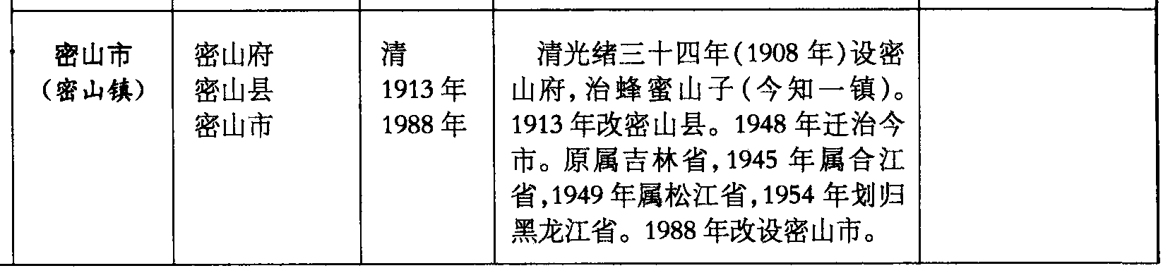 密山市(密山镇)密山府密山县密山市清1913年1988年清光绪三十四年(1908年)设密山府,治蜂蜜山子(今知一镇)。1913年改密山县。1948年迁治今市。原属吉林省,1945年属合江省,1949年属松江省,1954年划归黑龙江省。1988年改设密山市。