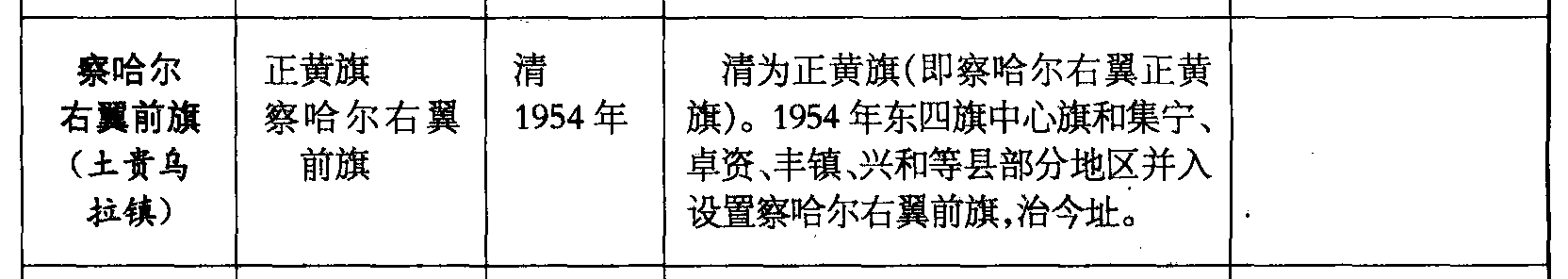 察哈尔右翼前旗(土贵乌拉镇)正黄旗察哈尔右翼前旗清1954年清为正黄旗(即察哈尔右翼正黄旗)。1954年东四旗中心旗和集宁、卓资、丰镇、兴和等县部分地区并入设置察哈尔右翼前旗,治今址。