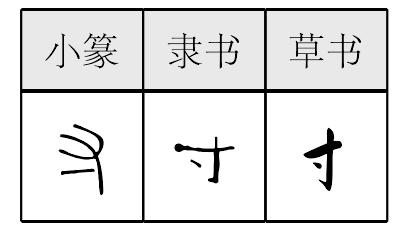 ❸愁肠寸断|尺短寸长|尺功寸效|掉三寸舌|断缣寸纸|肝肠寸断|回肠寸断|聊表寸心|柔肠寸断|三春寸草|身无寸缕|手无寸铁|鼠目寸光|小善寸长|铢称寸较|铢积寸累|铢累寸积 寸cùn寸,甲骨文、金文就是“又”(手),小篆为指事字,指的是手腕之下一寸之处,即中医所说的“寸口”,引申为长度单位。作意符生成的字有:寻、守、导、寺等。作声符生成的字有: cun 阴平:村(村庄) 阳平:蹲(方言,“蹲了腿”;另读dūn) 上声:忖(忖度) 刌(割,截断) zun 阴平:尊(端着酒杯敬酒,“寸”表音也表意。引申为“尊敬”) 遵(遵照) 樽(酒樽) 上声:撙(节省) chèn 衬(衬托) 寸(cùn)“ ,十分也。人手却一寸动脉,谓之寸口。从又,从一。凡寸之属皆从寸。”(仓困切) 徐锴《系传》:“一者,记手腕下一寸。此指事也。” 段玉裁注:“度别于分,忖于寸。禾部曰:‘十发为程,一程为分,十分为寸。’……却,犹退也。距手十分动脉之处,谓之寸口。故字从又、一,会意也。” 甲骨文中只有“又”(又,表示手),没有“寸”字。战国文字始见“寸”字。寸为长度单位十分,秦简已经有此用法。如睡虎地秦简《秦律十八种·仓律》:“隶臣、城旦高不盈六尺五寸,隶妾、舂高不盈六尺二寸,皆为小;高五尺二寸,皆作之。”[1] 到《说文》小篆中,寸字有了较强的构字能力。“甲、金文中从又与从廾的那些字,一般表示手的动作或可以握在手中的小型酒器。小篆改为寸,则有了更深一层的意思,即表示法度:封、尊、爵等与分封爵位有关,射、导、寻,与丈量有关,尉、乃、辱、寺,与刑法、治狱有关。寸,作为一个新的成字形位被大量使用,而且有了明确的造意,这是周秦时代法制严密、继承权与分封制确立、度量衡有了统一标准等社会状况的反映。”[2] “寸”是会意字,以人体为标准来作为长度单位。事实上,周制中寸、尺、咫、寻、常、仞都是以人体为标准的。“寸”是较短的长度单位,所以由它组成的词多含有“短”、“小”之义,如短暂的时间称“寸旬”,微薄的俸禄称“寸禄”,短暂的闲暇称“寸隙”,极小的步子称“寸步”等。又“寸口”为中医诊脉的部位名。 寸部有六个属字。如:“專,六寸簿也。从寸,叀声。一曰:專,纺專。” 寸cùn(3画)