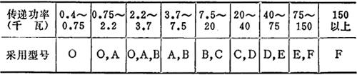 (1)传动比 一般情况下传动比应小于7,必要时可达10。 (2)皮带速度(V) 对于O、A、B、C型V≤25米/秒 对于D、E、F V≤30米/秒 一般可在5~25米/秒内选取,最适速度为20~25米/秒 (3)中心距离(A) 0.55(D1+D2)+h≤A≤2(D1+D2) 式中 h——三角皮带高 D1及D2——小皮带轮及大皮带轮计算直径。 (4)包角 在开口传动时,小皮带轮的包角,不得小于120°。 (5)各断面三角带适用的功率范围见13-36。 表13-36 各断面三角带适用的功率范围  |