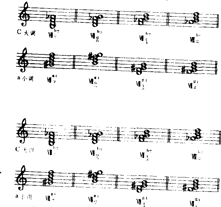 释义 | 导七和弦 导七和弦Daoqi hexian在大、小调中的Ⅵ级(导音)上建立的七和弦称之为导七和弦。在大调上Ⅵ级七和弦是减小七和弦; 在自然小调上建立的导七和弦是大小七和弦。它们的结构形式如图中a、b。但在实际音乐作品中,使用更多的是和声大调和和声小调上的Ⅵ7,即把大调的Ⅵ级“La”降低半音;和声小调的Ⅶ级sol升高半音。这样变化的结果,把和弦中相邻音间的距离均变为小三度,根音至七音之间为减七度,在和声学上把这种结构的和弦,称为减减七和弦,简称为“减七和弦”,它们的标记则为Ⅵ7b7 (大调) 和Ⅶ7#1(小调) 见图c,d : 导七和弦包括了音阶调式中的全部“动音”,可以说是集不稳定音之大成,因此这个和弦动力性、矛盾性、不协和性最大,是任何其它和弦所不可比拟的。另外从音色上看,由于它极不协和,因此更适合表现惊愕、悲怆,但它也可以表现激情、喜悦、紧张、动荡等多种感情,这也是其它和弦所不能比拟的。还有由于它的调性模糊不清,便于调性转换,像个四通八达的通道,转向任何调都很方便,由于导七和弦具有以上特点,因此作曲家都很喜欢用它来表现多种感情变化。 导七和弦也有一个原位,三个转位和弦。 导七和弦常常解决到主和弦,有时也可解决到属七和弦。解决方法是: ☚ 伴奏配置的一般步骤 导七和弦的应用 ☛ |