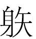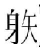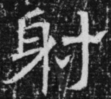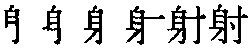 【提示】身,位于字左时,末笔的撇上端由出头改成不出头。身中间的两横,宋体与左右两边相接,楷体与左边相接,与右边相离。 *射〔 〕shè10画 身部 (1) 放箭: 驰~。 (2) 用机械力或其他力量把子弹等快速送出去: ~击|扫~|高~炮|~门(足球)。 (3) 液体快速喷出: 喷~|~了一身水。 (4) 放出(光、热、电等): ~线|反~|辐~|光芒四~。 (5) (言语、作品等)有所指: 影~|暗~。 射 ☚ 矢 矯 ☛ 射䠶shè甲骨文从弓从矢,象矢(箭)在弓上,发射义。后或加又(手),象用手射矢形。春秋初期石鼓文将矤讹成身字,又字到小篆成寸,小篆讹成射字,作为或体。正体讹从身从矢。现作异体字。见《异体字表》。由射箭义现代引申为用推力或弹力送出子弹等。如:高射炮|扫射。又指液体受到压力迅速流出。如:喷射|注射。又指放出光、热等。如:反射|放射|光芒四射。又引申有所指。如:暗射|影射。 射 ★异◎异★常◎常