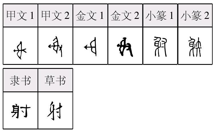 表意,甲骨文1、金文1象张弓搭箭之形,甲骨文2、金文2字形增又或寸,又与寸均为手,表示手持弓箭以射;小篆1把弓讹为身,隶定为“射”。本义读shè,开弓射箭,引申为光线照射、影射(言语有所指,用言语伤害人)、用枪炮射击、用压力或动力送出、放出电波等;又读yè,用于“仆射”,古代官名,唐宋时相当于宰相。又作“ ”,从身从矢。《异体字表》以“ ”为异体字。 【辨析】 以“射”作音符构成的形声字读音不同。shè:麝∣xiè:谢、榭。射 甲 金 篆 隶shè【析形】会意字,甲骨文字形像矢在弓上,会射箭之意。金文字形增意符又(手),以示用手拉动弓弦。小篆字形弓矢之形讹变作“身”,“又”旁又变成“寸”旁。 【释义】《说文》:“弓弩发于身而中于远也。”本义是射箭。由箭的射出引申指光线的照射。如[光芒四射]。射箭要对准靶子,故可表示有所指,如[影射]。 【shape analysis】It is the associative character. In Oracle it looks like the arrow on the bow, which means shooting an arrow. In Bronze Inscriptions a meaningful part又(手)(shǒu,hand)that means pulling the bowstring with the hands is added. After Small Seal script it has changed into 身(shēn,body)and 又(手)(shǒu,hand) into 寸(cùn, a unit of length). 【original meaning】 Shooting the arrow. 䠶 ☚ 隻 舁 ☛ 00000340 |