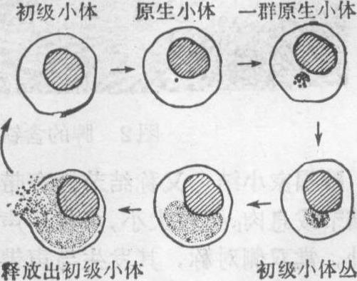 释义 | 古代名物 > 人體類 > 頭面部 > 面 > 小體 小體 xiǎotǐ 耳目之類器官的總稱。其稱始載於先秦典籍。《孟子·告子上》:“孟子曰:‘從其大體爲大人,從其小體爲小人。’”朱熹注:“小體,耳目之類也。” 小体xiǎo tǐ身体的次要器官,如耳目之类。参见“大体❶”。 小体bodies泛指动物组织或细胞内形成的有一定形态结构或染色特点的细小物体。不同小体有不同的本质,有的肉眼可见,有的必需用电子显微镜观察。如病毒性传染病中的包涵体(见“包涵体”),血红蛋白变性沉淀引起红细胞浆内形成海恩兹(Heinz)小体,慢性炎症时浆细胞的嗜品红小体(Russel's bo-dies),雌性动物的神经细胞及大部分体细胞核膜内有异染性小体(Barr's body),又称性染色质。 小体 小体小体是指在组织或细胞内形成的具有一定形态结构或染色特点的细小物体。有的肉眼可见,如体腔中的小游离体;有的只能在镜下见到。不同小体的本质不同,各有其临床病理意义。 图1 Negri小体 Gamma-Favre小体 又称Miyagawa小体。腹股沟淋巴肉芽肿病时,见于血管内皮细胞胞质内的一种嗜碱性包涵体。可能是由退化的核物质所形成的。 Guarnieri小体 天花的丘疹或水泡期病变中,表皮细胞胞质内或细胞核中呈圆形或椭圆形、略带颗粒性的嗜酸性小体。直径可达10μm。其周围有空晕。电镜下证明此小体内含有病毒颗粒。因Paschen首先发现这小体内有病毒存在,故又称Paschen小体。 Lipschutz小体 水痘局部表皮内呈气球样肿胀的细胞胞核内的一种体积较大的嗜酸性包涵体。电镜下证明此包涵体含有病毒颗粒。核内包涵体在早期为嗜碱性,后期为嗜酸性,Feulgen染色阴性。此小体亦可见于带状泡疹及单纯泡疹患者。 巨细胞性包涵体 巨细胞包涵体病时,在病变器官如涎腺、肾、肝、肺、胰、甲状腺、脑等,可见到明显肿大的上皮细胞或间充质细胞(直径可达40μm以上),在这种细胞的胞核内,可见到嗜酸性包涵体,直径可超过15μm,其周围可有空晕。电镜下可见包涵体为排列紧密、细颗粒性网状的染色质中有散在病毒颗粒(巨细胞病毒)。在这种细胞的胞质内,可有较小的嗜碱性包涵体,其中亦含有病毒颗粒。上述这两种包涵体均称为巨细胞性包涵体。包涵体内存活的病毒不引起组织的细胞反应,但如病毒死亡,其分解产物则可在一些器官如涎腺、肝、肾、肾上腺等中引起灶性坏死。 软疣小体 在传染性软疣的鳞状上皮细胞 (主要在颗粒细胞层,也可在棘细胞层细胞胞质中)中可见到很多的包涵体,称软疣小体。此小体首先在基底细胞层出现,为单个、小圆形嗜酸性小体。当基底细胞不断增大并向上移位时,包涵体亦随之增大上移。当到达颗粒细胞层时,软疣小体可以很大,并将受累细胞的胞核压挤于一侧呈新月形。其最大直径可达35μm,同时由嗜酸性转变为嗜碱性。最后在表层上皮细胞内可见嗜碱性软疣小体。软疣小体含病毒(病毒很大,直径达0.35μm)。由于在发展过程中DNA的含量不断增加,故Feulgen反应不断增强,同时上皮细胞中的透明角质蛋白也逐渐消失。 图2 软疣小体 沙眼小体 又称Halberstraedter-Prowazek小体或Prowazek-Greeff小体。沙眼和包涵体结膜炎的致病因子均为大型病毒样体,属衣原体属,故统称沙眼包涵体结膜炎(TRIC)病原体,即TRIC初级小体。TRIC初级小体感染眼结膜后即进入上皮细胞胞质内,这时如用Giem-sa法染眼结膜刮片,即可在胞质中见到紫色圆形小体,直径250nm。不久,初级小体为较大的卵圆形原生小体所代替。原生小体再不断分裂,又产生新一代的初级小体,再不断继续繁殖,即在胞质中形成由初级小体构成的,基质含有糖原的包涵体,称沙眼包涵体。包涵体形成后,随初级小体继续增多而不断增大,最后初级小体充满上皮细胞胞质,终至胞膜破裂,初级小体溢出,再感染其他上皮细胞。 图3 沙眼小体 Plimmer小体 又称Behla小体。为小圆形或卵圆形玻璃样小体,有时见于恶性肿瘤细胞的胞质或间质内,呈嗜酸性或双嗜性,可能有包膜。Plimmer曾认为是肿瘤的病原性寄生物,现在认为是包涵体或退化性产物。 图4 Plimmer小体 玻璃样小体 是对细胞内出现的均匀一致、嗜伊红染色、境界清晰的物质的统称。它可出现于许多不同情况,其本质及形成机理极不一致。上述一些病毒性疾病时,受损细胞内所见的包涵体,也可称为玻璃样小体。但是,通常所谓的玻璃样小体则包括下列几种,也即细胞的透明变性。 肾近端曲管上皮细胞内玻璃样小体 多发生在肾病综合征或肾近端曲管上皮细胞严重受损时,在其胞质内可见有大小不等圆形嗜酸性小体,这可能是由于细胞受损时细胞内的变性产物或尿内蛋白质被肾小管上皮细胞重吸收而形成。 图5 玻璃样小体 Mallory小体 酒精性肝硬化时,退变中的肝细胞胞质内可含有圆形、不规则形或网状的嗜酸性玻璃样小体,位于胞核附近,称Mallory小体或酒精性玻璃样小体。这种病在中国是很罕见的。 Councilman小体 黄热病时,在坏死的肝细胞胞质中见到的嗜酸性玻璃样小体(不含有病毒)。可逸出,进入肝窦。 Russell小体 在非特异性的慢性炎症组织中,浆细胞胞质内见到的嗜酸性玻璃样小体。电镜下,该小体为存在于扩张的内质网内的一种免疫球蛋白。胞膜破裂后,该小体即游离于组织中。 肝细胞嗜酸性小体 病毒性肝炎时,肝细胞胞质可含有一个或多个嗜酸性小体或颗粒,称为嗜酸性小体。这是肝细胞受损变性的表现。电