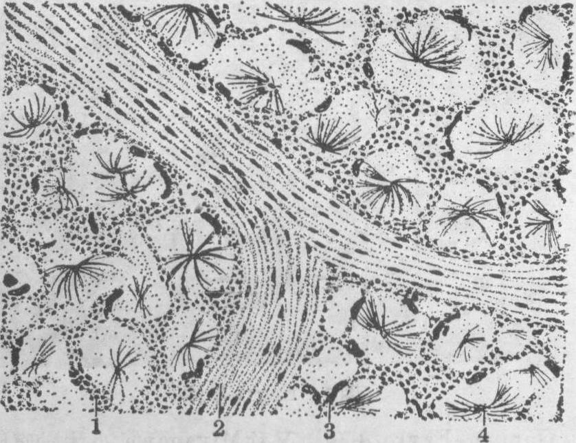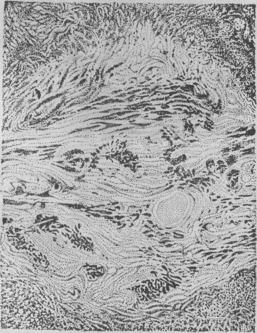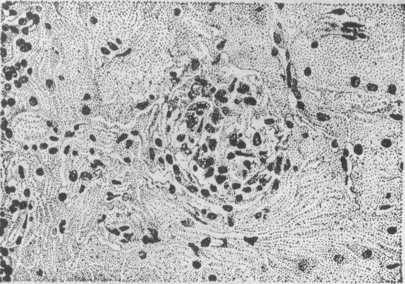 释义 | 小结或结节 小结或结节局限性细胞增生所形成的境界清楚的病灶称为小结或结节。小结(结节)大多是一种炎性增生性反应,有的小结(结节)则是由于某些物质或病原体的局限性作用所引起。 图1 脑的斑疹伤寒小结 胶质细胞小结 病毒性脑炎时在脑及脊髓灰质内常见细胞排列密集而成的小结,小结内的细胞数目由数个至十数个,大的可超过一百个,细胞核的形状或为杆状(似小胶质细胞),或为圆形,或为碎裂的多形核。这些小结常发生在变性坏死的神经细胞周围,或在小血管附近。关于小结细胞的成分和来源至今认识不一致,多数人认为它是小胶质细胞局部增生的结果,故称之为胶质细胞小结。也有些作者认为它是来自血液的单核细胞。小结的多少与神经细胞的变性坏死程度有关,而与淋巴细胞围管性浸润不一定成比例。脑炎的胶质小结和斑疹伤寒小结的形态虽近似,但后者以小血管为中心,且血管内皮细胞显著增生,与脑炎的胶质细胞小结不同。典型的胶质细胞小结见于各种病毒性脑炎如乙型脑炎、狂犬病以及脊髓前角灰质炎等。细菌和其他病原引起的炎症无此反应。各种病毒性脑炎中的胶质细胞小结形态都彼此类似,只是分布有所不同,如狂犬病时主要在延髓、中脑黑质、脊髓后根节等处(又称Babes结节),乙型脑炎以间脑、中脑、大脑皮质为多。 土拉菌病小结 土拉杆菌经皮肤、眼结膜或消化道感染人体,主要在皮肤、淋巴结、肺、脾等处发生局灶性坏死和增生性炎症反应,肉眼观似粟粒结核结节,称土拉菌病小结。灰白色,早期为2~3mm大小,小结中心为广泛的坏死,外周为巨噬细胞。晚期较大,形似结核性肉芽肿,中心部的坏死区变小,其外为放射状排列的类上皮细胞,有时有少数郎罕巨细胞。坏死区内常查不到本杆菌,须与猫抓热、结核等病的小结鉴别。 矽结节 因吸入二氧化硅 (SiO2)的粉尘引起,主要发生于肺内。矽肺病变程度与吸入矽尘的多少及矽尘的大小有密切关系。直径大于5μm的矽粒在空气中易下沉,吸入的机会较少,且吸入后易被呼吸道粘膜排出;小于5μm的矽粒则较易吸入肺内,引起矽结节。矽尘还可扩散到肺门等淋巴结以及脾、肝内,形成矽结节。 矽结节的形成机制迄今仍未完全了解,有三种可能的致病方式: ❶直接化学作用: 吸入的SiO2遇组织中的水分,逐渐溶解形成矽酸,由矽酸引起组织损害和纤维化。因SiO2溶解度低,所以作用慢而持久,矽结节可逐渐扩大。但实验证明各种矽粒溶解度高低与矽结节的大小不成正比例,可见不是单纯由此引起的。 ❷生物膜损伤的间接作用:吸入的SiO2被巨噬细胞吞噬后,被胞质中的吞噬体包绕,与溶酶体融合,形成次级溶酶体。SiO2在其内形成矽酸,可破坏溶酶体膜,使之崩解,大量水解酶和矽酸遂进入细胞质内,使细胞内结构溶解致细胞坏死。坏死细胞释出的细胞分解产物和矽酸等引起周围纤维组织增生而形成结节。实验证明,可的松、克矽平等可保护溶酶体膜不受破坏,此时矽粒不引起纤维化。 ❸免疫作用: 吸入的SiO2与组织中的蛋白质结合形成抗原,与自身抗体结合后沉积于矽粒周围。据Pernis等测定,矽结节内透明变性的部分除含胶原和脂质外,还含有大量的丙种球蛋白。但这些球蛋白也有可能是矽结节从血液中吸附来的,其沉积可使已形成的结节增大,却不一定是结节形成的始因。 矽结节常先发生于肺膜下、血管旁和呼吸性支气管的肺泡,可能因这些部位较为固定,呼吸时活动较少,矽粒容易沉积之故。在这里,矽粒被巨噬细胞吞噬后,被带入肺泡壁,并逐渐集中到血管和支气管旁等淋巴组织较多的部位形成结节。肺门淋巴结是SiO2集中的部位,也是出现变化最早的部位,其次在淋巴结以外的肺中央区和肺膜下病变较重。 矽结节的大小与疾病的发展阶段有关,早期呈粟粒大小,直径为1~2mm,晚期可增大到2cm以上。圆形或圆柱形,分界清,灰黑色,致密硬实。显微镜下只在极早期含细胞较多。通常看到的矽结节均由同心环状或涡状排列的胶原纤维所成。纤维呈明显的透明变性,以结节中心最显著。在结节中心有时还可看到小血管的残余。结节内很少有细胞核,结节外层则有受挤压的纤维细胞及少数淋巴细胞浸润。用偏光显微镜观察,在结节中可见矽粒,以外围部为多。由于矽粒的持续作用,外围不断纤维化,结节逐渐扩大,邻近的结节可互相融合,故于重症病人晚期,肺内结节多而且大。 矽末与煤末混合沉积在肺内可引起煤矽结节。结节中心似上述矽结节,但含有煤尘,结节外围有宽广的黑色煤尘沉积之纤维化带。类风湿病人吸入矽尘时,形成的结节既多且增大迅速,其外层的纤维细胞呈栅栏状排列,与一般矽结节不同。可能是因类风湿病人的免疫机能异常,矽尘引起之组织反应就比一般人更显著。肺的这种结节称为类风湿尘肺结节(Caplan病灶)。 含铁小结 多见于高度淤血的巨脾中,为黄色或褐色的米粒大硬结,分散于红髓内。镜下见小结多为长条形或圆形,常在脾小梁附近。小结内有密集的纤维组织,苏木素伊红染色时常见三种不同颜色的物质: 在小结内有多数染成紫蓝色长短不一的纤维条,条间夹杂有灰绿色半透明杆状结晶样物质,外层有多量褐黄色的含铁血黄素颗粒。从前曾把这些杆条状物质当作真菌,误认是本病的病原体,其后证实它只是铁和钙盐沉积的胶原纤维。凡是能引起脾静脉淤血的病,如门脉性肝硬化、晚期血