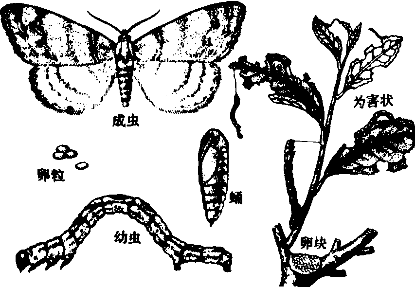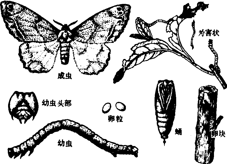 释义 | 尺蠖尺合chǐ huǒ❶比喻缩伸量长度。例:用手拃蠖一下,~有多长。 尺蠖chǐhuò一种蛾的幼虫,体细长,行动时体向上变成弧形,成虫危害果树、茶树等。俗称吊死鬼儿。 古代名物 > 蟲豸類 > 昆蟲部 > 蛾蝶 > 尺蠖 尺蠖 chǐhuò 亦作“蚇蠖”,單稱“蠖”。尺蠖蛾的幼蟲。似蠶絶小,食菜葉。爬行時屈伸向前,如布手度物,故稱。《易·繫辭下》:“尺蠖之屈,以求信也。”孔穎達疏:“尺蠖之蟲,初行必屈者,欲求在後之信也。”信,通“伸”。《爾雅·釋蟲》:“蠖,蚇蠖。”唐·白居易《代書詩一百韻寄微之》:“伸屈須看蠖,窮通莫問龜。”《爾雅翼·釋蟲》:“尺蠖……如人以手度物,移後指就前指之狀,古所謂布指知尺者,故謂之尺蠖。《後漢書·律曆志》曰:‘寸者,忖也;尺者,蒦也。’則蒦自有尺之義矣。”清·陳大章《次韻姜西溟秋日雜感》:“尺蠖屈伸存我法,蝸牛負載亦吾廬。” 尺蠖【同义】总目录 尺蠖桑阖 害虫 害虫害虫名:蚜(蚜虫;菜~;棉~;桃~;烟~;麦~) 蛾(蛾子;螟蛾;麦~;菜~;衣~;蓑~;毒~;天蚜;夜~;枯叶~) 蚧(红蜡~)蝽(蝽象;荔枝~) 螟(螟虫;大~;桑~;菜~;稻~虫;三化~;玉米~) 蛉(棉~) 蝚 虸(虸蚄) 蟪(~蛄) 蟘 蠖(尺蠖) 蠷(蠷螋) 螨(螨虫;彩~;草~;尘~) 蝶 蠰 螬 蝉(灰~;叶~;稻叶~) 蜮 蜜虫 腻虫 粘虫 油虫 蟥虫 蠓虫 毛虫 竹象 龙虱 白蚕 樟蚕 天牛 地胆 田鳖 步曲 蓟马 樗鸡 芫菁 瓜守 叶甲 牙甲 葬甲 桑蟥 麦蛆 叶蛆 斑蟊 蜤螽 油葫芦 稻飞虱 桑木虱 红娘子 地老虎 黄守瓜 小红虫 金花虫 食心虫 钻心虫切根虫 夹叶虫 卷叶虫 稻苞虫稻象虫 铁甲虫 铁壳虫 硬壳虫乌壳虫 放屁虫 另见:叮咬 翅膀 爬行 飞翔 为害 ☚ 害虫 各种害虫 ☛ 尺蠖geometrid为害茶树芽叶的一类害虫。主要有茶尺蠖(Ectropis obliqua hypulina We-hrli)、油桐尺蠖(Buzura suppressaria Guenee)、木橑尺蠖(Culcula panterinaria Bremer et Grey)、云尺蠖(Buzura thibetaria Oberthur) 等, 均属鳞翅目尺蠖蛾科。 茶尺蠖 生活习性 在江苏和安徽一年发生5~6代; 在杭州6~7代, 以6代为主。若10月平均气温在20℃以上,可能部分发生7代。均以蛹在树冠下土中越冬。在杭州翌年3月初开始羽化出土, 一般4月上、中旬第一代幼虫开始发生, 危害春茶。第二代幼虫于5月下旬至6月上旬发生, 第三代幼虫于6月中旬至7月上旬发生, 均危害夏茶。以后大体上每月发生一代, 直至最后一代老熟幼虫入土化蛹。从第三代开始世代重迭。成虫有趋光性, 羽化后第二、三天黄昏开始产卵, 卵产于上部枝桠间、茎基裂缝或枯枝落叶上, 平均每一雌虫产卵300余粒。成虫寿命一般3~7天, 卵期5~32天,各代不一。初孵幼虫爬行迅速, 不畏阳光。2龄后怕阳光, 晴天日间常躲在叶背或丛间隐蔽处, 以腹足固定,体躯大部离开枝叶。受惊动后,立即吐丝下垂,清晨及黄昏后取食最盛, 1龄幼虫仅食嫩叶叶肉,残留表皮, 呈褐色点状凹斑。2龄即咀食穿孔,或自嫩叶边缘咬食, 形成缺刻。3龄后食量激增。各代幼虫平均历期11~48天。幼虫老熟后入土作土室化蛹, 入土深度一般1厘米, 也可达1.5~3厘米, 数量多时可在落叶间化蛹。一般以在根际20厘米内为最多。非越冬蛹历期7~13天,越冬蛹可长达5个月左右。一般以丘陵茶园发生较多, 高山茶园发生较少。茶尺蠖有许多天敌,以茶尺蠖绒茧蜂、斜纹猫蛛、病毒、拟青霉及鸟类等常有相当控制能力。 防治 结合秋冬深耕施基肥, 将树冠下表土中虫蛹, 深埋施肥沟底; 培土镇压; 放鸡除虫。幼虫发生时, 喷施50%辛硫磷1 500~2 000倍液,50%杀螟松、90%敌百虫或50%杀螟腈1 000倍液,或拟除虫菊酯类农药6 000~8 000倍液。注意保护天敌。 油桐尺蠖 分布与为害 又名大尺蠖, 各主要产茶省均有分布, 湖南、湖北、广东、广西、福建等南方地区为害较重。幼虫蚕食叶片, 除茶树外, 还危害油桐等树木。 形态 成虫银灰色, 体长20~25毫米, 翅展50~70毫米, 翅面多有黑色小点,前翅有黄褐色波纹3条,后翅两条。雌蛾腹部肥大, 末端有一束黄色绒毛。初孵幼虫灰黑色, 2龄以后转黄绿或淡绿, 4龄后体色随栖息环境而变化, 淡绿、深绿或深褐色等。成长幼虫体长70毫米左右, 头部密布棕色小颗粒, 头顶中央凹陷, 体表粗糙, 气门紫红色,第7~8节体背各有突起一对。蛹圆锥形, 体长19~27毫米, 棕色褐色, 头部有角状突起一对, 腹末有刺一枚, 突起两个。 生活习性 在长江流域一年发生2~3代, 华南一带一年发生3~4代, 均以蛹在根际表土内越冬。湖南、江西等省于4月下旬成虫羽化产卵, 5月上中旬第一代幼虫开始孵化, 6月中、下旬老熟化蛹, 7月中、下旬至8月下旬成虫羽化产卵, 7月下旬到9月上中旬第二代幼虫陆续孵化危害。广东1~3代幼虫分别于5月中旬7月中旬至8月中旬, 9月下旬至11月中旬发生为害。成虫多在傍晚羽化, 白天喜栖息于茶园附近大树及电杆等建筑物上, 两翅平展不动, 受惊即坠地假死或短距离迁飞。傍晚至次日清晨交配, 卵成堆产于树干皮层缝隙、孔洞内或茶丛枝桠处。初孵幼虫爬至植株上部吐丝下垂,借风力飘移分散危害。3龄前食量小, 只在叶缘和叶尖取食上表皮及叶肉, 显示黄褐色或黄绿色食痕。2龄后食量加大, 取食全叶,仅留部分主脉。幼虫停食时,腹足夹住叶缘(3龄前)或枝杆,虫体斜竖如枝条。老熟后入土1~2寸作土室化蛹。 油桐尺蠖 防治 冬季逐园挖除越冬虫蛹。各代成虫期中逐日清晨寻觅扑打成虫。利用成虫喜光趋白和成堆产卵于孔洞缝隙的习性, 可用草把刷石灰水悬挂或竖立