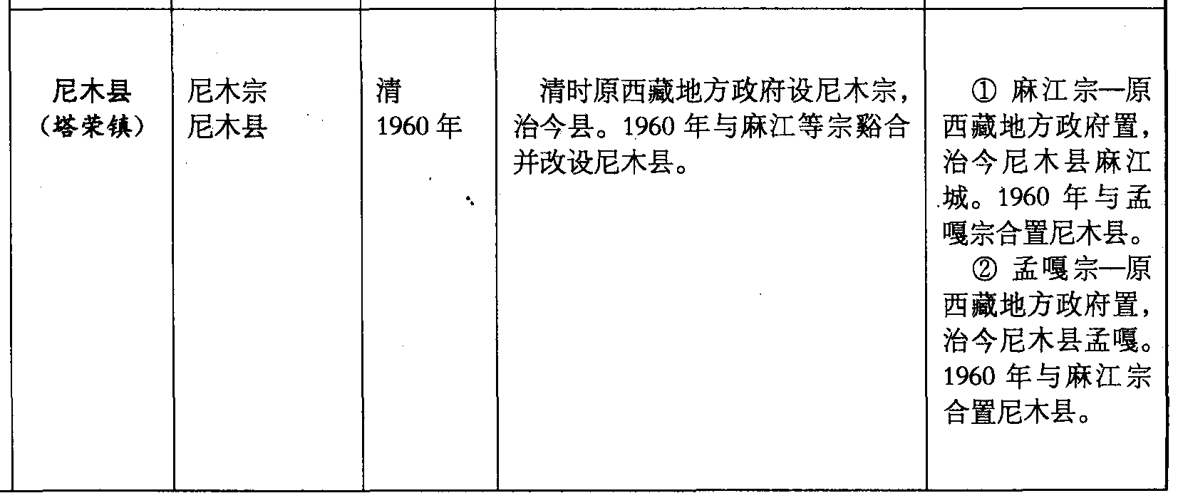 尼木县(塔荣镇)尼木宗尼木县清1960年清时原西藏地方政府设尼木宗,治今县。1960年与麻江等宗谿合并改设尼木县。❶ 麻江宗—原西藏地方政府置,治今尼木县麻江城。1960年与孟嘎宗合置尼木县。❷ 孟嘎宗—原西藏地方政府置,治今尼木县孟嘎。1960年与麻江宗合置尼木县。