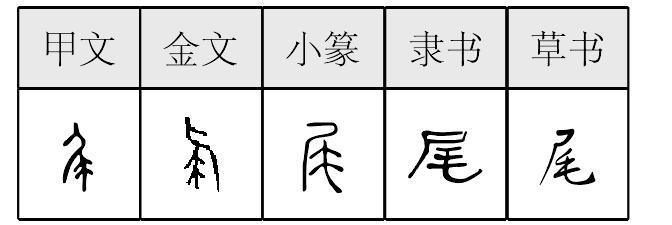 ❹ 蚕头燕尾|藏头露尾|彻首彻尾|彻头彻尾|貂续狗尾|狗续貂尾|虎头蛇尾|街头巷尾|龙头蛇尾|泥涂曳尾|掐头去尾|去头去尾|畏首畏尾|无头无尾|吴头楚尾|依头顺尾|蝇附骥尾|有头有尾|斩头去尾 尾(wěi)“ ,微也。从到毛在尸后。古人或饰系尾,西南夷亦然。凡尾之属皆从尾。”(无斐切) 甲骨文作 ,象人后有装饰的尾形。甲骨文词义不明。小篆成为从尸,从毛。许慎用“微”训“尾”,这是声训。微是微小、细微的意思;尾部细微,所以训为“微”。他还说古代西南少数民族有这种在身后装饰羽毛的习俗。王筠说,“尸”应为“皮”之省,故“尾”应指禽兽之尾而言。但从甲骨文看,“尾”的构意为人饰之尾;引申为动物之尾。 尾部有三个属字。如“屬”字下云:“连也。从尾,蜀声。”又如“屈”字下云:“无尾也。从尾,出声。”又如“尿”字下云:“人小便也。从尾,从水。”会意字,古书上多假借“溺”字表示。 尾(7画) ❶wěi ❷yǐ
