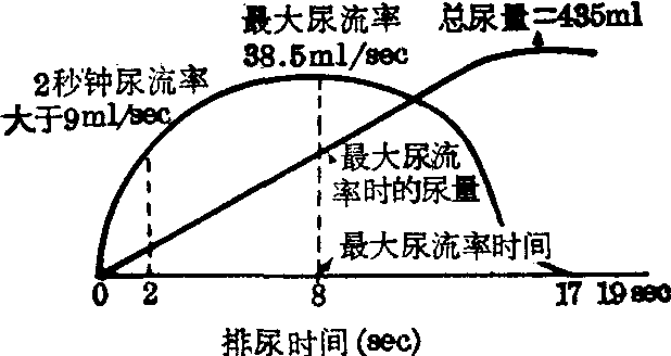 尿流率测定: 主要用于诊断下尿路梗阻。方法简单而无损伤,但需特殊仪器记录每秒钟的尿流率并描绘成曲线。依此曲线可推算出各尿流率参数(图),包括最大尿流率、平均尿流率、2秒钟尿流率、最大尿流率时间、尿流时间及总尿量等。其中意义较重要的是最大尿流率及尿流时间。总尿量少于200ml时测定结果的准确性很差。正常尿流率参数随着总尿量的多少而有变异。因此测定结果须与该总尿量时的各正常参数作对照,才能明确测定结果是否正常。一般认为最大尿流率在每秒25ml以上者可排除下尿路梗阻,在每秒10ml以下者提示有梗阻。尿流率的测定若与排尿期膀胱内压测量法同时进行,则诊断下尿路有无梗阻的准确性更高。