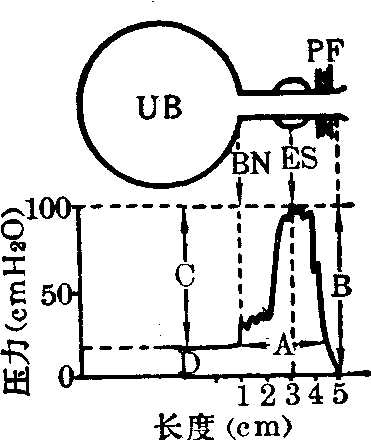 尿道括约肌阻力测定:插F-16导尿管至球部尿道,连接一Y形接管,一端接一测压玻璃管,另一端接消毒生理盐水瓶。连续滴注无菌液至尿道,以手握紧阴茎阻止液体自尿道逸出。测压管内水柱上升至最高水平,即为尿道括约肌阻力。正常人为80~100cmH2O。