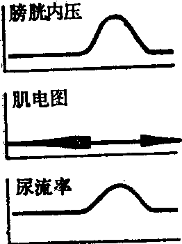 膀胱压力-尿流率-肌电图的联合检查 (正常)。在膀胱充盈时括约肌活动力逐渐增强,在排尿前突然停止活动,排尿结束前又开始逐渐恢复活动