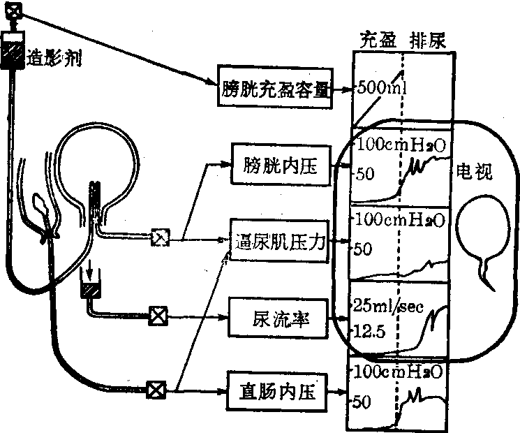 下尿路动力学的6道程同步检查。6道程包括膀胱充盈量、膀胱内压、直肠内压、尿流率,电视以及用自动电子仪器自总压力中扣除直肠内压后的逼尿肌压力