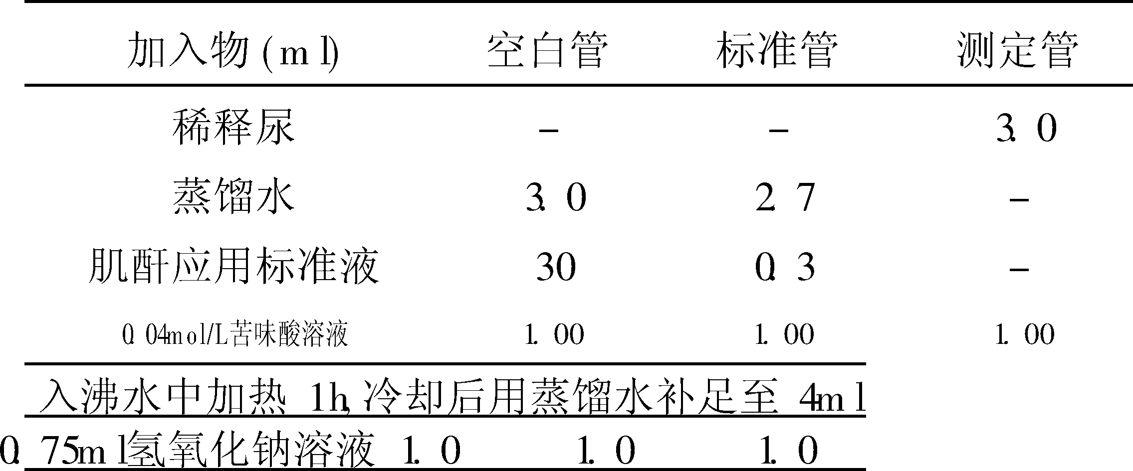 测定原理与所用试剂均同血肌酐测定。测定步骤如下: