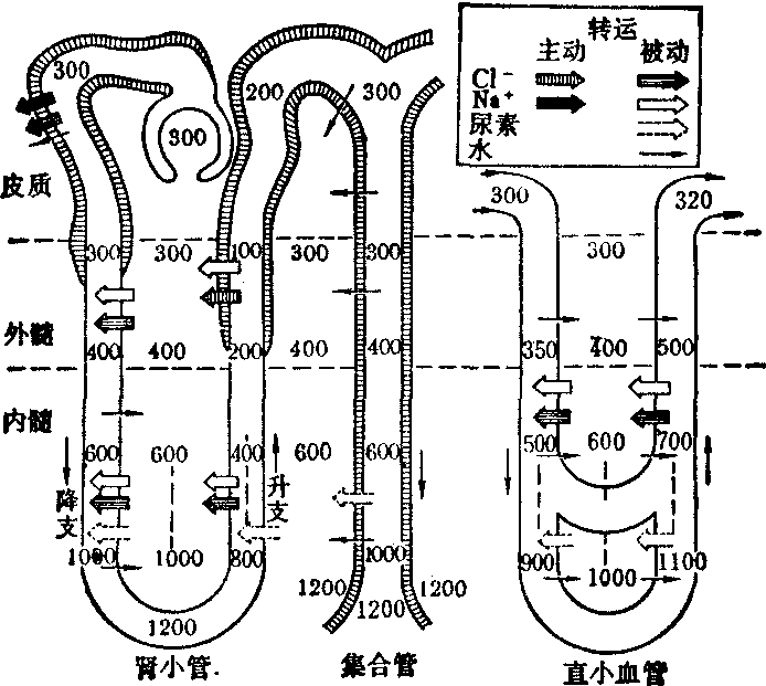 释义 | 尿的浓缩和稀释 尿的浓缩和稀释尿的浓缩或稀释,是以尿和血浆的渗透压(以渗透浓度来表达,单位为毫渗/升,即mOsm/L)相比较而言,如果尿的渗透压比血浆的高,称为浓缩尿;反之,则为稀释尿。在人体,尿极度浓缩时,尿的渗透浓度可高达1,200~1,400mOsm/L,约为血浆的4倍,尿的比重约为1.030~1.035;尿极度稀释时,其渗透浓度可降至30~40mOsm/L,比重约为1.001。 尿浓缩的机理——逆流系统假说示意图 除了Na和Cl离子外,尿素也是造成髓质高渗的重要成分。这里组织液中的尿素是由内髓部的集合管中透出的,可以被动地转运入髓襻升降两支的细段,然后经过远曲小管而聚积于皮质和外髓部的集合管中,在抗利尿激素作用下,一部分尿素可由内髓部的集合管转到组织液,其余的随尿排出(见图)。 髓质直小血管的逆流交换作用 肾髓质组织间液的高渗浓度梯度形成后能够保持相对稳定状态,有赖于血液在髓质的U形直小血管中逆向流动时不断地与其周围的组织间液被动地转运溶质和水(参见图的右半)。这种简单的物质转运形式称为逆流交换作用,其关键在于直小血管的管壁通透性很大。由于髓质的组织液中存在着高渗的浓度梯度,当血液在直小血管中流动时,髓质组织液中的NaCl和尿素等溶质得以透入直小血管的降支,相应地提高了其中血浆的渗透浓度;当血液返折于升支时,由于升支中血浆的渗透浓度略高于组织液,于是有一部分溶质透出管外而回到组织液。水的透过方向则与溶质相反。这种逆流交换的生理意义是使髓质组织液中的溶质不易被血流大量带走,从而能保持组织液的渗透浓度相对稳定。 集合管在尿浓缩和稀释过程中的作用 浓缩尿或稀释尿的最后形成,取决于集合管的通透性,以及集合管内与髓质间液的渗透平衡。机体在缺水时,抗利尿激素分泌增加,于是便加强了远曲小管和集合管,特别是后者对水的通透性,加之集合管系经过高渗的髓质区而至肾盏,故其中的水分大量外渗到髓质的组织间液中,直至达到渗透平衡时为止,这就极大地提高了集合管内尿液的渗透浓度,结果所排出的终尿将是浓缩尿; 如果机体内水分过多,则由于抗利尿激素的分泌受抑制,集合管中水分不被重吸收或吸收很少,于是终尿将是稀释尿。 激素对尿浓缩和稀释的调节 尿浓缩和稀释的过程受到一些激素的调节,抗利尿激素能加强远曲小管和集合管,特别是后者对水的重吸收。在机体缺水时,抗利尿激素分泌增加,于是小管液中的水分被重吸收而增加,这样一方面保存了体液中的含水量,另方面排出了少量高浓缩的尿。反之,当抗利尿激素分泌受阻时,则排出大量稀释尿。 醛固酮对肾的作用主要是“保钠排钾”,它在促进远曲小管和集合管对钠的重吸收的同时,继发地促进氯与水的重吸收,结果细胞外液量也等渗地增加。这是醛固酮的作用与抗利尿激素不同之处,因为后者只促进游离水的重吸收。所以醛固酮对水的重吸收作用固然明显地影响血浆量和尿量,但并不直接影响血浆和尿的渗透压,因而与尿的浓缩和稀释关系较小。 影响尿浓缩和稀释的因素 尿浓缩和稀释的过程受到下列因素的影响。 髓襻逆流倍增作用的减弱 凡肾脏疾患损及内髓,特别是乳头部组织时,将使尿浓缩能力减弱。例如慢性肾盂肾炎引起的肾髓质纤维化;肾囊肿引起的髓质萎缩;钙盐在肾髓质沉积等等,都将使髓质的逆流系统遭到不同程度的破坏,而减弱尿浓缩的能力。凡能影响髓襻升支粗段对Cl-主动转运的各种因素,必将影响尿量的排出。强效利尿药如速尿和利尿酸,其作用被认为是在于抑制髓襻升支粗段Cl-的主动转运,使髓质组织液的高渗梯度难于形成,从而极大地减少水的渗透性重吸收,引起稀释尿的大量排出。 此外,尿素在形成髓质组织液高渗梯度中起着重要作用,而尿素来自蛋白质的代谢,故在营养不良时,尿浓缩能力减弱。实验表明,给予尿素,可使缺乏蛋白质食物的大白鼠提高尿的浓缩能力。老年人尿浓缩能力衰退者,只要肾髓质结构正常,也可借助于蛋白质食物的增加而得到改善。 直小血管逆流交换作用的减弱 直小血管的逆流交换作用在保持肾髓质高渗梯度中起重要作用,故直小血管的血流变化也将影响尿的浓缩程度。例如当直小血管血流加快时,血浆中的NaCl和尿素等可被大量带走,以致髓质间液难以保持高渗;高血压病初期累及肾脏时,尿浓缩能力降低,也可从肾髓质小血管血流加快来得到解释。在失血性休克发展到一定程度时,由于交感神经兴奋,引起肾内血流量重新分布,皮质血管收缩,血流量减少;而髓质血管受神经作用较小,直小血管血流量相对地较多,结果髓质间液高渗梯度难以保持,以致患者不能排出浓缩尿。 集合管对水通透性的改变 如果集合管管壁本身有病变,如肾脏淀粉样变性必将影响到集合管对水的重吸收,使尿的浓缩能力降低。 此外,如果抗利尿激素释放减少或缺乏,造成集合管管壁对水的通透性显著降低时,尿液的浓缩程度将显著下降。 渗透物质和游离水的清除率 肾对尿浓缩和稀释的能力可以用渗透活性物质清除率 (简称渗透物质清除率Cosm)和游离水清除率(CH2O)来测定。 渗透物质清除率系指单位时间内,有多少血浆清除了其中所含的与尿中相等的渗透物质总量,以ml/min为单位,其计算式如下: ![]() 上式V为单位时间内的尿量(ml/min),Uosm和Posm分别为尿和血浆中的渗透浓度(mOsm/L),可以冰点下降法测定,