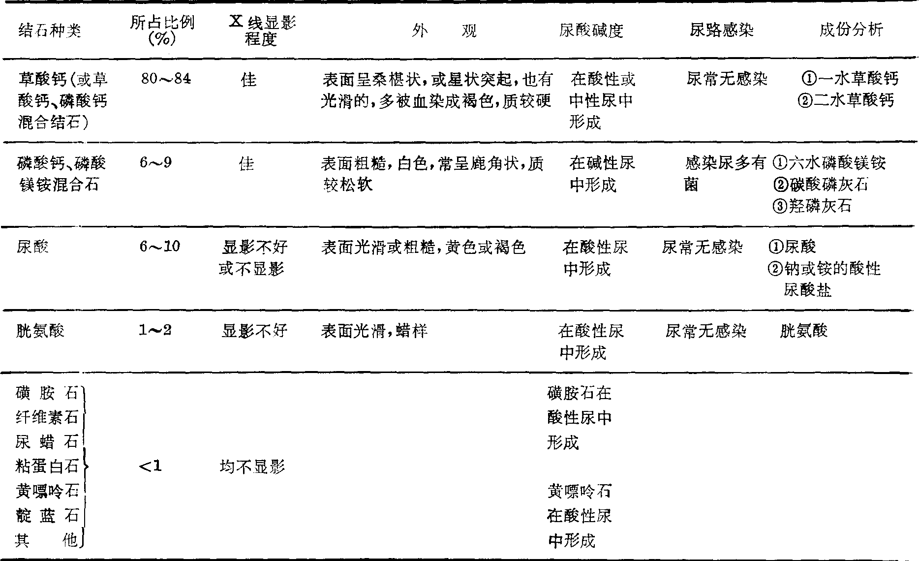 释义 | 尿路结石包括肾、输尿管、膀胱和尿道结石,是泌尿系常见的疾病。结石成因与尿路感染、梗阻、代谢紊乱及生活环境有关。表现有腹部或腰部绞痛及血尿。梗阻时可出现脓尿及肾积水。X线平片多数可直接显影。治疗可用药物排石,或行体外冲击波碎石术,必要时手术取石。 尿路结石 尿路结石又名砂淋。乃结石留滞于肾、输尿管、膀胱及尿道所致。症见腰痛剧烈,转侧不安,血尿,尿中夹砂石,排尿困难,点滴而下或尿闭。治疗:❶药线点灸三焦俞、下关元、阴陵泉。 ☚ 老鼠偷粪门 身痒症 ☛ 尿路结石 尿路结石尿路结石是泌尿系的常见病,是肾、输尿管和膀胱等结石的统称。其中肾和输尿管结石称为上尿路结石; 膀胱和尿道结石称为下尿路结石。尿路结石由尿内多种晶体物质和非晶体物质沉积、聚集而成。结石的病因尚未明确,故防治方法也不满意。尿路结石多见于青壮年,世界上有许多膀胱结石的所谓“结石多发区”如泰国、埃及、印度、智利、巴西等。我国尿路结石发病率在云南、广东、贵州等地较高;而东北和西北等省发病率较低。解放后,由于营养条件改善,过去常见的小儿膀胱结石已明显减少,而成年人的上尿路结石却逐渐增加。 各种尿路结石的物理化学性质 病因 结石的病因复杂,大致可分为三类。 (1) 局部病因有: ❶尿淤积。尿路梗阻引起的尿淤积,导致尿中晶体或其他颗粒滞留而形成结石。尿路梗阻往往继发感染,形成所谓“感染石”,多为磷酸钙和磷酸镁铵石,结石的出现又加重梗阻,造成恶性循环。长期平卧位,不利于尿液引流,同时还可导致骨胳脱钙,增加形成结石的机会。 ❷感染。有些细菌可分解尿素产生氨使尿碱性化,促进磷酸盐析出,形成磷酸镁铵结石。感染时细菌、坏死组织和脓块等可成为结石的核心。结石易继发感染,后者又使结石迅速增大或形成多发结石。 ❸异物。尿路的异物如导尿管、丝线,由于经常与尿液接触,日久也可成为结石的核心。 (2)新陈代谢紊乱: ❶钙代谢紊乱。高血钙可引起高尿钙,形成含钙的尿石,约占全部尿石的90%。高血钙和高尿钙可由甲状旁腺激素分泌增加所致。此激素既增强骨细胞的溶骨作用,使骨胳钙进入血循环,并提高肠管对钙的吸收,使血钙升高;又作用于肾脏,降低磷酸盐的再吸收,增加尿内磷酸盐排出,因此血磷显著降低。通常血钙和血磷的乘积为一常数,血磷降低则导致血钙升高。因此约60%甲状旁腺功能亢进症可引起高尿钙,发生肾结石。肾结石病人中2~16.5%由甲状旁腺功能亢进引起。其他如乳碱综合征、维生素D中毒、恶性肿瘤、皮质醇症和原发性高尿钙症等,均可引起高血钙和高尿钙而形成尿石。 ❷尿酸代谢紊乱。原发性者多见于痛风,目前发现先天性酶的异常导致嘌呤代谢紊乱。继发性者见于白血病、肿瘤等,尤其抗癌治疗过程中大量细胞破坏时。在浓缩的酸性尿中尿酸析出形成结石。 ❸黄嘌呤代谢紊乱。由于黄嘌呤氧化酶缺乏,也可导致黄嘌呤结石,但很罕见。 ❹胱氨酸代谢紊乱。常见于先天性胱氨酸尿的病人,由于肾小管再吸收功能异常,尿中数种氨基酸含量均增高,而不易溶解的胱氨酸晶体析出形成结石。 ❺营养紊乱和维生素缺乏。婴幼儿可因营养缺乏而发生膀胱结石,动物实验中,维生素A缺乏可使尿路上皮角化、脱屑,成为结石核心。而成人的含钙和尿酸肾结石却与进食过多的乳制品、肉类、糖类有关。 ❻肾小管性酸中毒,是一少见的肾小管病变。系远端肾曲管排出氢离子的功能障碍(I型),或近端肾曲管再吸收碳酸氢盐功能障碍(Ⅱ型)所致。病人因酸中毒,引起骨胳脱钙,钙自尿路排出而形成肾结石。Ⅰ型最易形成肾结石和肾钙化。草酸钙结石是最常见的结石,但患者血尿化验结果均正常,目前对病因尚缺乏了解。 (3)气候、水质、遗传、性别和药物等因素对结石形成也有一定的影响。日照时间长,气候干热可使尿浓缩,容易形成尿石。有报道正常人尿石发病率是1:1,000,而结石病人子女的尿石发病率高达40:1,000,提示与遗传因素有关。男性尿石较女性多见,可能与女性尿道短而粗,尿中枸橼酸含量和保护性胶体较多有关。此外,某些药物如磺胺噻唑和磺胺嘧啶等磺胺类药物、利尿药乙酰唑胺、抗结核药氨硫脲以及索米痛、四环素等都有引起结石形成的可能。 结石形成的理论 (1) 肾钙斑学说: Randall (1937年)发现在肾小盏内,肾集合小管上皮细胞有钙化斑的病理变化,表面粘膜脱落后,钙斑即成尿石核心。同时在尿石标本中发现有自肾小盏脱落的痕迹。显微X线摄影及X线衍射技术发现钙斑分布似在淋巴系统内,因而认为结石形成和肾的淋巴系统有关。 (2) 胶体学说: 尿是含有粘液素、核酸、硫酸软骨素、糖类等胶体物质的胶体溶液,由于胶体的保护作用,能溶解更多的溶质。当胶体“老化”后就出现溶质沉淀而形成结石。黑种人、妇女、孕妇尿中胶体活性较高,他们结石的发生率较其他人低。 (3)基质学说: 认为尿石的形成,必须先有基质模型,然后晶体沉附其上形成尿石。基质为一种粘蛋白,其中64%为蛋白,由八种氨基酸组成,15%为糖类,其中1/3为氨基糖。基质的主要来源是尿中的类粘液素。在质和量上正常人和多发结石病人之间似有所不同。 (4) 抑制物学说: 认为正常人尿中含有某些能防止晶体沉淀的物质,而结石病人尿中缺少这种抑制物。镁离子、枸橼酸、焦磷酸盐和某