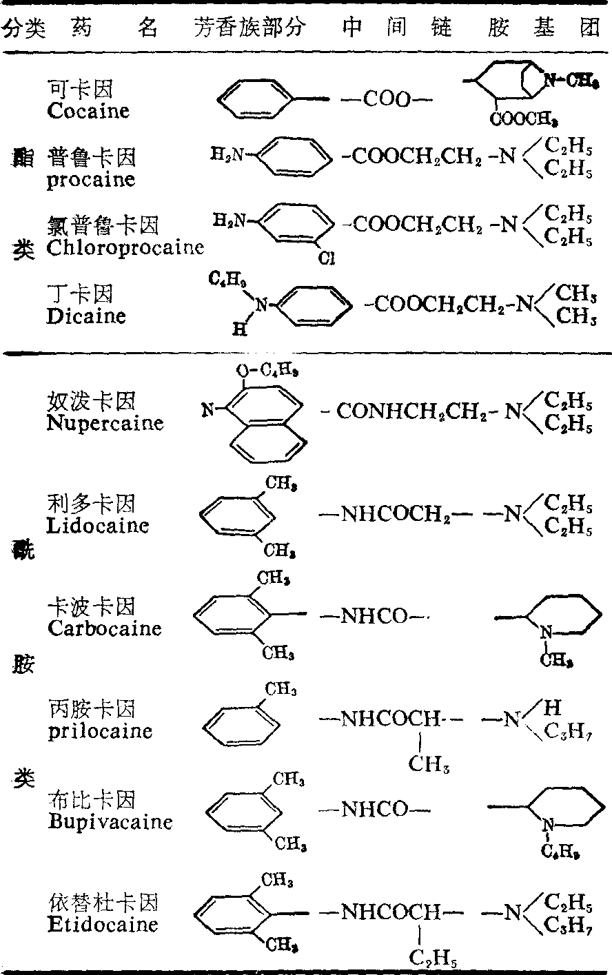 *依据硬膜外阻滞 ☚ 解热镇痛抗炎药 普鲁卡因 ☛ 局部麻醉药 局部麻醉药局部麻醉药 (简称局麻药)指用来阻抑外周神经传导,使被阻滞区域产生暂时可逆的痛觉消失,达到进行手术或缓解疼痛的药物。除局麻药外,其他如奎尼丁样抗心律失常药,抗组织胺药和三环类抗郁抑药等,也都具有局麻作用。本条目所涉及的仅限于作局部麻醉用的药物。化学结构 临床常用的局麻药有一个共同的化学结构型:芳香族部份—中间链—胺基团。芳香族部分是局麻药分子中亲脂性部分,胺基团是亲水的,中间链一般是酯(—COO—)或酰胺 (—NHCO—)。根据中间链的结构不同,可将临床上常用的局麻药分成两大类,即含酯链的称为酯类,含酰胺链的称为酰胺类。酯类局麻药包括可卡因、普鲁卡因、氯普鲁卡因和丁卡因等。酰胺类包括地布卡因、利多卡因、卡波卡因、丙氨卡因、布比卡因(丁吡卡因或勃庇伏卡因)和依替杜卡因等(见表1)。