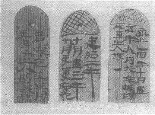 西汉成帝时期。木质。1974年于居延遗址出土。现藏于甘肃省文物考古研究所。纪年签三枚。西汉成帝建始五年签(公元前28年),长10.7厘米,宽2.7厘米。释文:建始五年四月府所下礼分算术。西汉成帝阳朔五年签(公元前20年),长12厘米,宽2.5厘米。西汉成帝鸿嘉二年签(公元前19年),长10.2厘米,宽3.4厘米,释文:鸿嘉二年五月以来吏对会入官(刺)签,又名楬,类似今之带有标志性的签。其上部作圆形,有穿孔,并多画网纹,下部书字。字的竖、捺、钩等画,多带有放纵夸张之笔,以图醒目。此签书比一般的简书体更显展拓。此组纪年签为两行竖向排列,它的组合为前紧后松,并且行际之间各字互相穿插,融为一体。此签书可谓开后世条幅章法之先河。签中字结体横扁,波挑生动,方折明晰,隶书的飘逸风姿,跃然签上。签书用笔任意,不拘一格,笔法真、草、隶相掺,使字形变化多端。章法参差错落,规整中富于变化。疏密对比的视觉效应和跌宕起伏气韵生动的节奏感给人留下了深刻的印象。