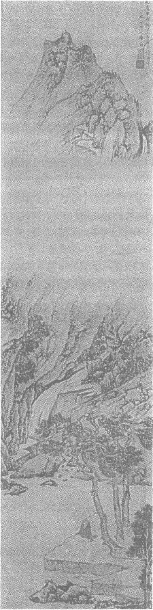 明。居节(见《居节潮满春江图轴》条目)绘。纸本设色。纵120厘米,横30.5厘米。北京故宫博物院藏。此图表现一位雅士临溪观瀑赏景的游乐图景。远处绘山峦巍峨耸立,山势峭拔,气势雄伟。山路蜿蜒直通山巅。飞瀑高悬,直落千仞。山腰全被云雾遮挡,烟岚弥漫。山腰下,瀑流注入山下的清溪之中,似能听到哗哗的流水声。近处松木蓊郁凝翠,高松下一人临溪盘坐,仰望高山瀑布,正陶醉于大自然山青水秀的优美景色之中,怡然自得。画风近似文徵明。构图新颖,笔墨工细,山石坡岸简笔勾皴,重墨点攒。设色雅淡。右上角自题:“万历甲戌秋日,写于玉峰舟中,商谷樵人居节。”下钤〈士真〉、〈居节印〉二印。