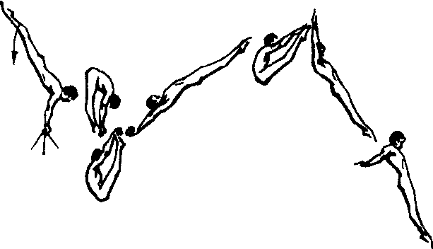 释义 | 屈体立撑后倒弧形屈体下 屈体立撑后倒弧形屈体下单杠低难度动作之一。技术要点:屈体立撑弧形后倒时要折拢身体,尽量提高臀位。后倒弧形前摆过程要蹬紧杠子。当臀部上摆接近杠前水平前,脚掌蹬离杠子向前急遽伸髋,随即突然制止。与此同时,松手并向前上猛跟上体。当两手触及脚面瞬间,立即制止上体靠拢,随即迅速向前下打腿,伸直髋关节。两臂迅速上举并保持含胸紧髋姿势准备落地。当熟练掌握屈体立撑后回环的技术后,可在中杠助力下直接练习。保护者位于杠前侧方,当其蹬离后,一手托腿助其制动,一手托背使其上体跟上。伸展时则在后面扶托腰侧助其平稳落地。 ☚ 支撑后摆向前屈体跳下 腾身回环分腿下 ☛ |