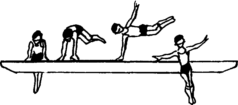 保护与帮助 保护者站在练习者马(箱)前右(左)侧方位置,当练习者跳起时,一手握其右(左)上臂,一手托其髋侧部,助其摆越马(箱)。