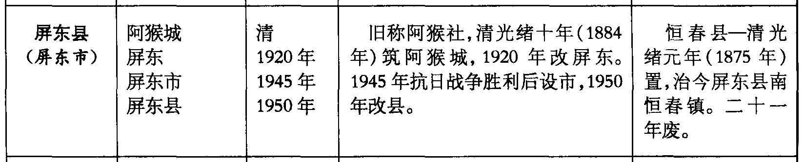 屏东县(屏东市)阿猴城屏东屏东市屏东县清1920年1945年1950年旧称阿猴社,清光绪十年(1884年)筑阿猴城,1920年改屏东。1945年抗日战争胜利后设市,1950年改县。恒春县—清光绪元年(1875年)置,治今屏东县南恒春镇。二十一年废。