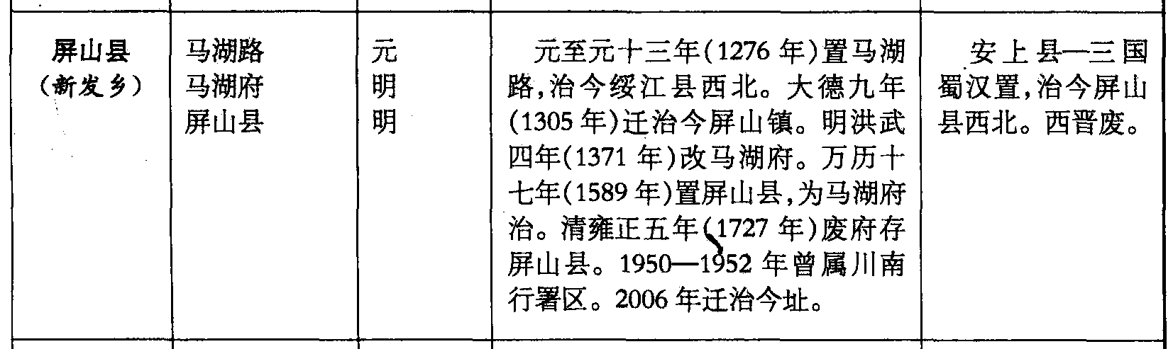 屏山县(新发乡)马湖路马湖府屏山县元明明元至元十三年(1276年)置马湖路,治今绥江县西北。大德九年(1305年)迁治今屏山镇。明洪武四年(1371年)改马湖府。万历十七年(1589年)置屏山县,为马湖府治。清雍正五年(1727年)废府存屏山县。1950—1952年曾属川南行署区。2006年迁治今址。安上县—三国蜀汉置,治今屏山县西北。西晋废。
