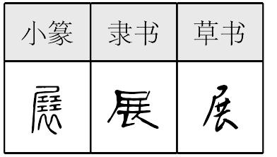 ❹ 愁眉不展|花枝招展|一筹莫展|迎风招展 展zhǎn (篆) 小篆由三部分组成:尸,表示人体;衣(省去“亠”);四个“工”字。形声字,尸、衣(省“亠”)为形,余为声(四个“工”字,读“知衍切”),声符也兼表意。也可认为是会意字,意思是把布料展开,量体裁衣。有展开义,如“百官之属,各展其物”(《左传·襄公三十一年》),《仪礼·聘礼》:“有司展群币以告。”作声符生成的字有: zhǎn 辗(辗转反侧) 搌(搌拭) niǎn 碾(碾磨)