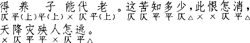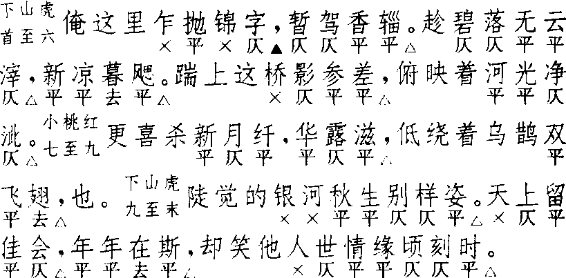 释义 | 山桃红 山桃红高明 《琵琶记》 ![]() ![]() 全曲十三句:4▲,4△。5△,4△。5△,5△。3,3,3△,也7△。5△,4△,7△。 其二 洪昇 《长生殿》 ![]() 全曲十三句:4▲,4△。5△。4△。4△,4△。3,3△,3△。也7△。5△,4△,7△。此曲分两式。两式的异点在第五、六句:第一式为两个五字句,集自〔小桃红〕;第二式为两个四字句,集自〔下山虎〕;他无所异。第一式见用于《琵琶记·书馆悲逢》四支,《六十种曲》本《琵琶记》误题〔小桃红〕,元本《琵琶记》题〔山桃红〕不误。《香囊记 ·得书》亦误为〔小桃红〕。相反,〔小桃红〕亦有误为〔山桃红〕者,如《玉玦记·渡江》。《紫箫记·换马》属第一式,其第十句及末句本七字句,均破为两个四字句,非有他异。第二式见用于《紫钗记·剑合钗圆》二支。《牡丹亭 ·惊梦》间用〔山桃红〕二支,前一支为第二式,后一支少作第五、六两句。《怀香记·佳会赠香》二支,《长生殿 ·密誓》一支,皆属第二式。《南词简谱》取《紫钗》为词式,定名〔山虎看桃〕,注谓“此即〔山桃红〕别一体”。今作第二式,原名〔山桃红〕无须改也。此外,尚有误题须分析者:如《龙膏记·闺病》之〔山桃红〕则为〔桃红虎〕之误题;《拜月亭·彼此亲依》、《红梨记 ·赴约》之〔山桃红〕则为〔正宫·小桃红〕之误题;而《鸾鎞记·鎞订》又将〔正宫·小桃红〕误题为〔山桃犯〕,《红梅记 ·改妆》之〔山桃犯〕则为〔正宫 ·桃红醉〕之误题。〔正宫〕与〔越调〕各有〔小桃红〕,名同实异;〔小桃红〕与〔山桃红〕相互误题;〔山桃红〕又分二式;以此纠缠混淆,皆须一一厘正。〔山桃红〕可代〔小桃红〕为首牌,后联〔下山虎〕、〔蛮牌令〕;亦可单用一支,或叠用二支、四支成套。 ☚ 小桃红 下山虎 ☛ |