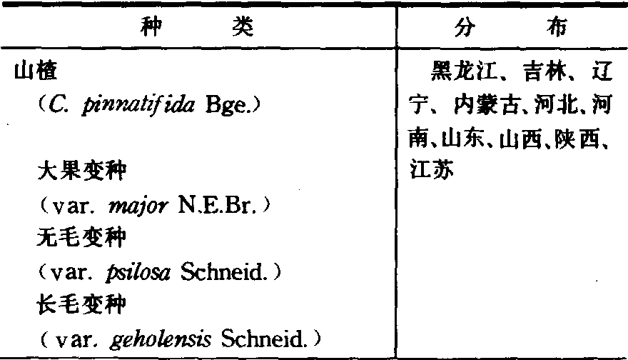 (续) 种 类 | 分 布 | 云南山楂 (C.scabrifolia (Franch.) Rehd.) | 云南、 贵州、四川、 广西 | 湖北山楂 (C.hupehensis Sarg.) | 湖南、 湖北、江西、 江苏、 浙江、四川、陕 西、 山西、 河南 | 陕西山楂 (C.shensiensis Pojark.) | 陕西 | 野山楂 (C.cuneata Sieb. et Zucc.) | 华中、 华东、 华南 各省 | 华中山楂 (C.wilsonii Sarg.) | 河南、 湖北、陕西、 甘肃、浙江、云南、四川 | 滇西山楂 (C.oresbia W.W.Smith) | 云南西北部 | 毛山楂 (C.maximowiczii Schneid.) | 黑龙江、 吉林、 辽 宁、 内蒙古 | 辽宁山楂 (C.sanguinea Pall.) | 辽宁、吉林、黑龙江、 河北、内蒙古、新疆 | 光叶山楂 (C.dahurica Koehne.) | 黑龙江、 内蒙古 | 橘红山楂 (C.aurantia Pojark.) | 山西、陕西、甘肃、 河北 | 中甸山楂 (C.chungtienensis W.W. Smith) | 云南北部 | 甘肃山楂 (C.kansuensis Wils.) | 甘肃、 新疆、山西、 河北、陕西、贵州、四川 | 阿尔泰山楂 (C.altaica Lange) | 新疆中部和北部 | 裂叶山楂 (C.remotilobata H. Kaik.) | 新疆中部和西部 | 绿肉山楂 (C.chlorosorca Maxim.) | 中国东北 | 准噶尔山楂 (C.songarica C. Koch.) | 新疆伊犁、 霍城 |