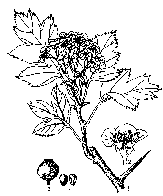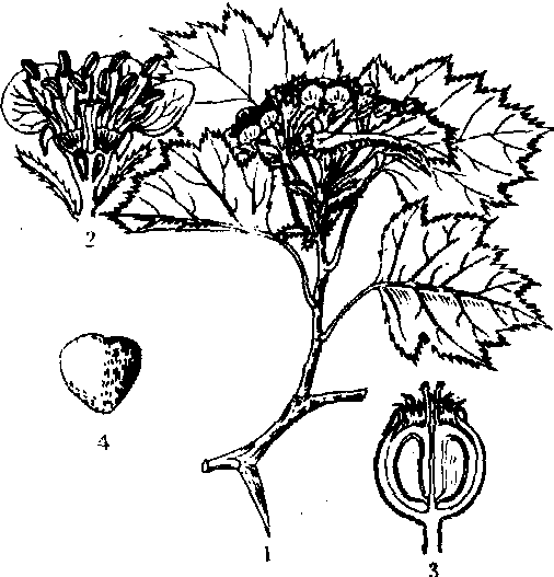 图3 阿尔泰山楂 1. 花枝; 2. 花纵剖面;3. 果实; 4. 果核 |