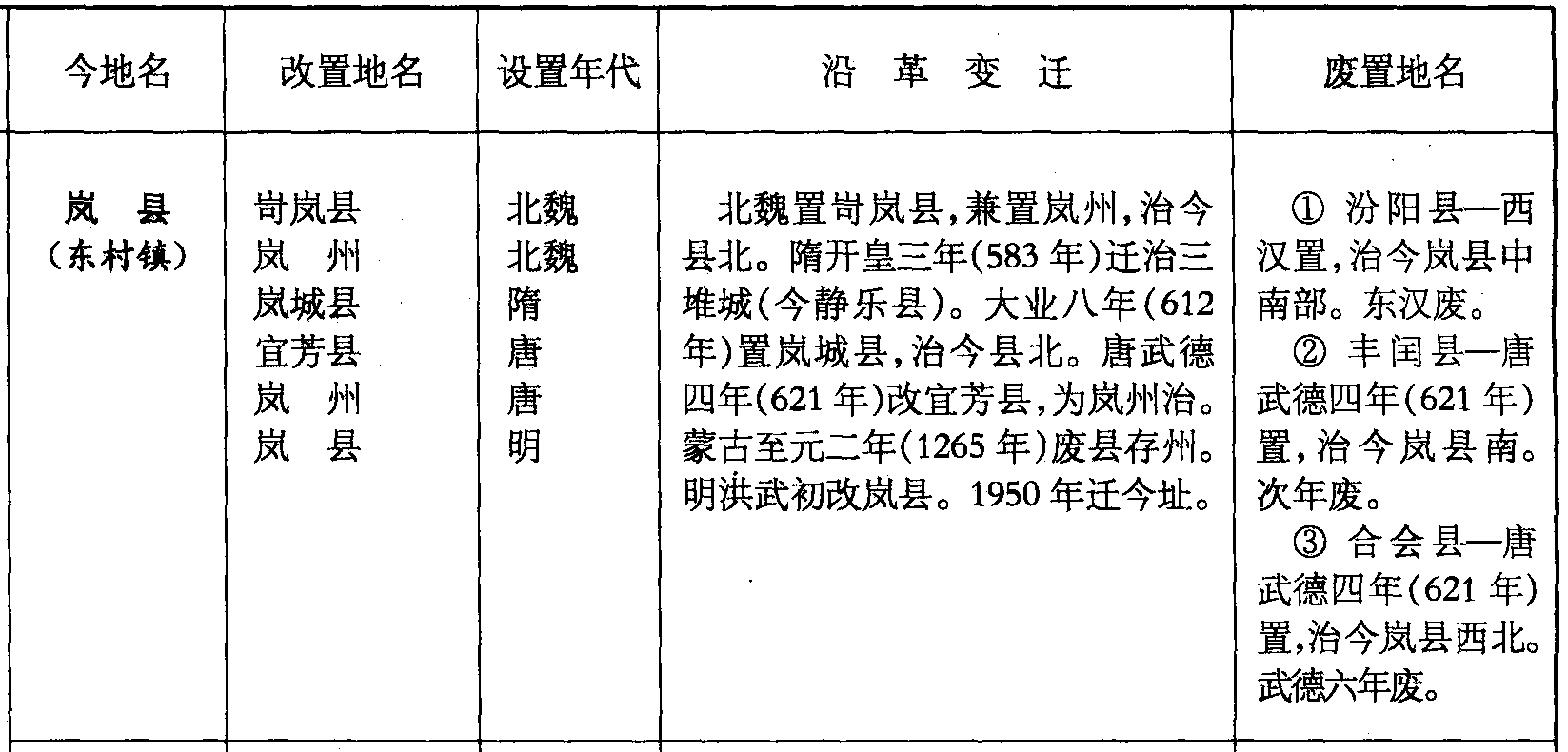 岚县(东村镇)岢岚县岚州岚城县宜芳县岚州岚县北魏北魏隋唐唐明北魏置岢岚县,兼置岚州,治今县北。隋开皇三年(583年)迁治三堆城(今静乐县)。大业八年(612年)置岚城县,治今县北。唐武德四年(621年)改宜芳县,为岚州治。蒙古至元二年(1265年)废县存州。明洪武初改岚县。1950年迁今址。❶ 汾阳县—西汉置,治今岚县中南部。东汉废。❷ 丰闰县—唐武德四年(621年)置,治今岚县南。次年废。❸ 合会县—唐武德四年(621年)置,治今岚县西北。武德六年废。
