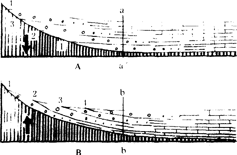 释义 | 岩相分析 岩相分析yanxiang fenxi利用岩相的变化来分析推断沉积物形成时的古环境变化,进而恢复地史时期的地壳运动和重塑地壳构造的发展阶段,这种方法叫岩相分析。岩相是岩石形成环境的物质表现,也就是沉积物的特征及生成环境的总和。岩相和古生物特征具体反映了沉积物形成时的自然环境。沉积岩的岩相可分为陆相、海相和海陆过渡相三种类型,每一类型还可进一步划分更细的类型。如海相可分为滨海相、浅海相、次深海相和深海相等。同一岩层在水平方向的相变反映了同一时期不同地区的自然地理条件的差异。如由滨海到浅海相,一般是由砾岩、砂岩、粘土岩到石灰岩的变化,所含生物化石组合也不相同。在垂直岩层剖面方向上的相变,则反映了同一地区不同时期的自然地理环境变迁。自然地理环境的重大改变往往是地壳运动的结果。当地壳下降时,海水侵漫陆地,陆地面积缩小,海洋面积相对扩大,称为海侵。这时所沉积的岩层,称海侵层位。海侵层位的特点是:在垂直剖面上,自下而上沉积物的颗粒由粗变细;由于海水面积越来越大,新岩层面积大于老岩层面积,形成超覆现象。当地壳上升时,海水退出陆地,陆地面积相对扩大,海洋面积相对缩小,称为海退。这时所沉积的岩层,称海退层位。海退层位的特点是:在垂直剖面上,自下而上沉积物的颗粒由细变粗;由于海水面积越来越小,新岩层面积小于老岩层面积,形成退覆现象,一套海侵层位和一套海退层位在垂直剖面上构成沉积物颗粒由粗变细,又由细变粗的有规律变化,表明该地区曾经历了一次下降和上升的完整过程,称为一个沉积旋回。 海侵层位(A)和海退层位(B) 1、2、3、4.海面位置的变化;aa′、bb′.垂直剖面 ☚ 地壳运动 岩层接触关系 ☛ |