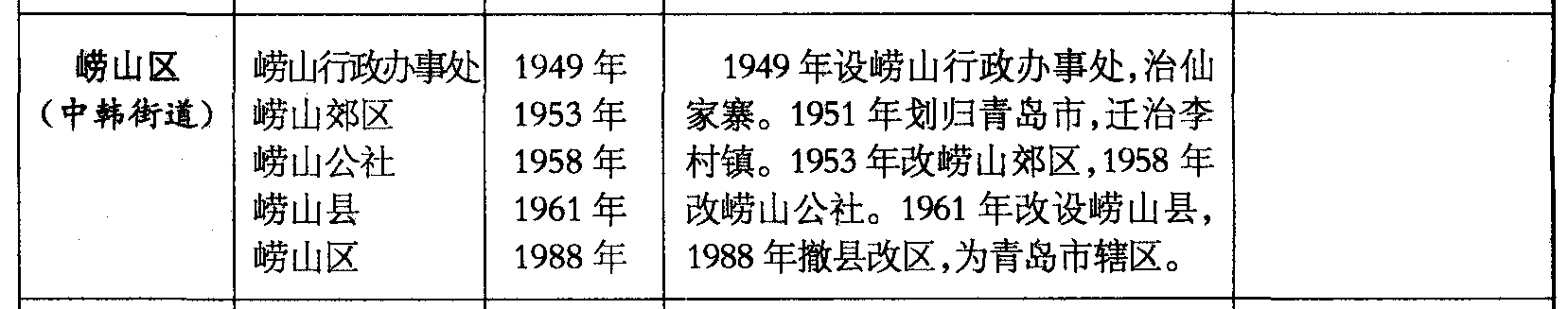 崂山区(中韩街道)崂山行政办事处崂山郊区崂山公社崂山县崂山区1949年1953年1958年1961年1988年1949年设崂山行政办事处,治仙家寨。1951年划归青岛市,迁治李村镇。1953年改崂山郊区,1958年改崂山公社。1961年改设崂山县,1988年撤县改区,为青岛市辖区。