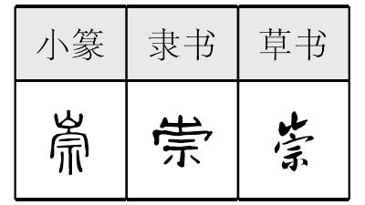 【提示】上面是山,下面是宗,不要错写成上面出、下面示的 “祟”。下面的示,起笔是横,不是点;第四笔宋体是撇,楷体是撇点。 *崇chóng11画 山部 (1) 高: ~高|~山峻岭。 (2) 重视;尊敬: ~尚|~敬|推~|尊~。 崇 ☚ 嵏 崔 ☛ 崇chóng上古形声字。从山,宗声。山高大状。引申指事物的高状。如:崇山峻岭|崇高的品质。再引申为尊重。如:推崇|崇拜|尊崇。 崇★常◎常