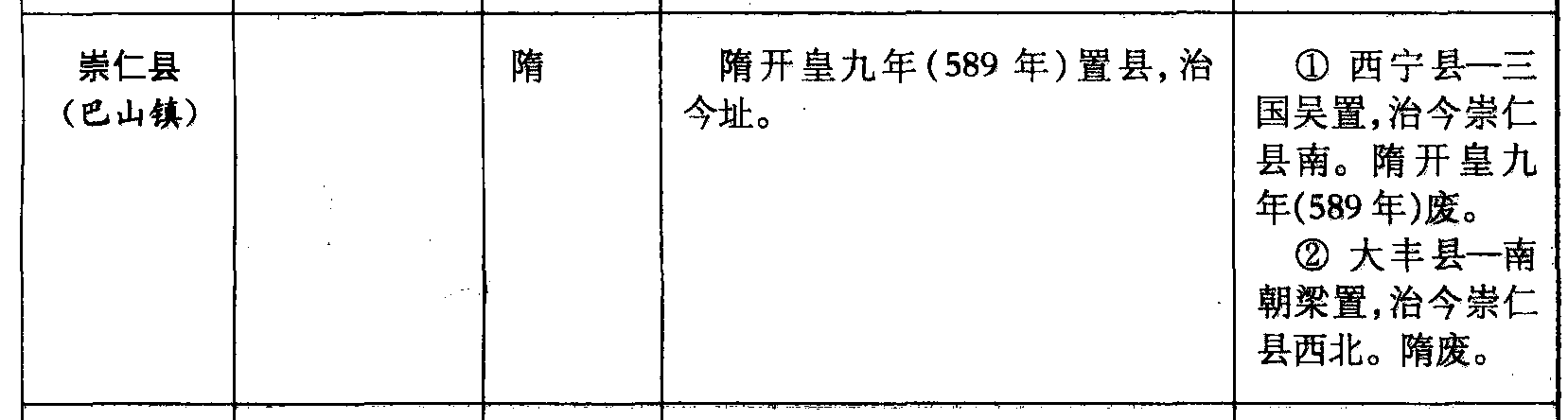 崇仁县(巴山镇)隋隋开皇九年(589年)置县,治今址。❶ 西宁县—三国吴置,治今崇仁县南。隋开皇九年(589年)废。❷ 大丰县—南朝梁置,治今崇仁县西北。隋废。