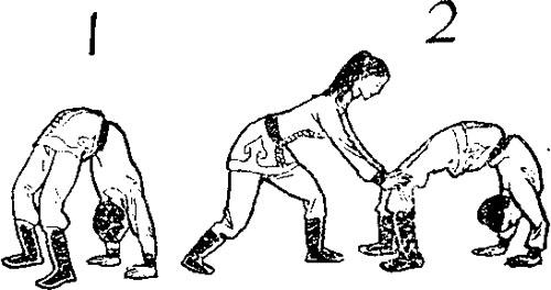 释义 | 下腰 武术腰功练习法。 两脚开立与肩同宽,两臂伸直向后摆动,同时腰向后弯,抬头,伸延腰躯,塌腕,两手撑地使身体成反弓形。该动作要求脚跟不离地,挺膝,挺髋,腰向上顶,伸肩,使桥弓拉大。 初练习下腰,可在同伴保护下帮助进行。 |