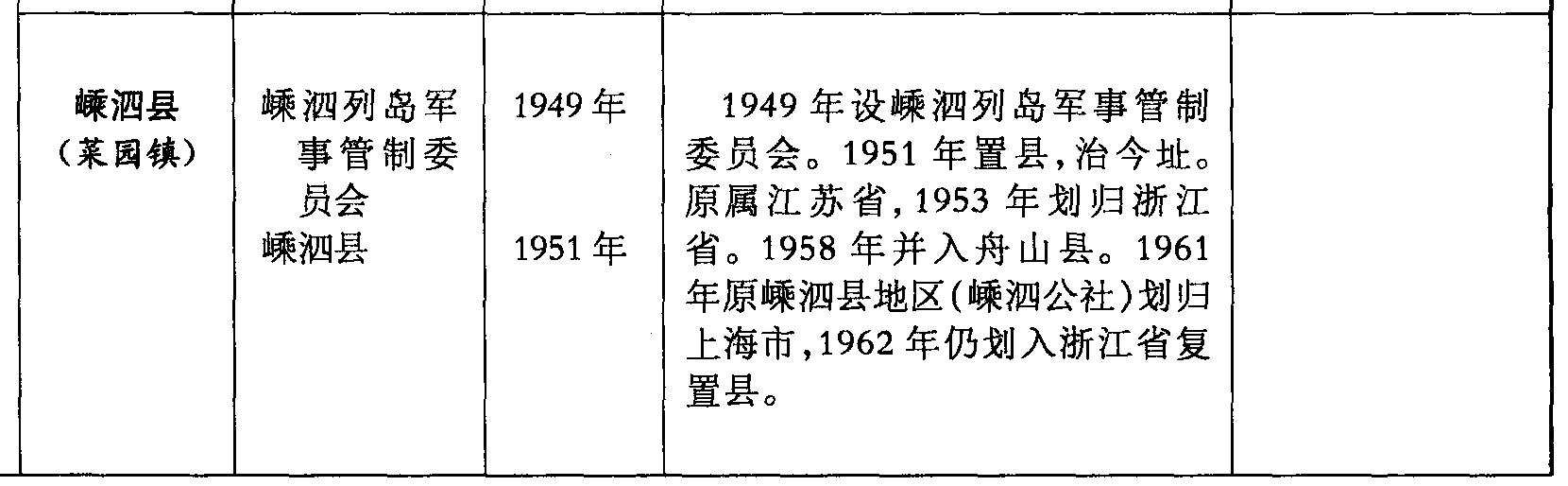 嵊泗县(菜园镇)嵊泗列岛军事管制委员会嵊泗县1949年1951年1949年设嵊泗列岛军事管制委员会。1951年置县,治今址。原属江苏省,1953年划归浙江省。1958年并入舟山县。1961年原嵊泗县地区(嵊泗公社)划归上海市,1962年仍划入浙江省复置县。
