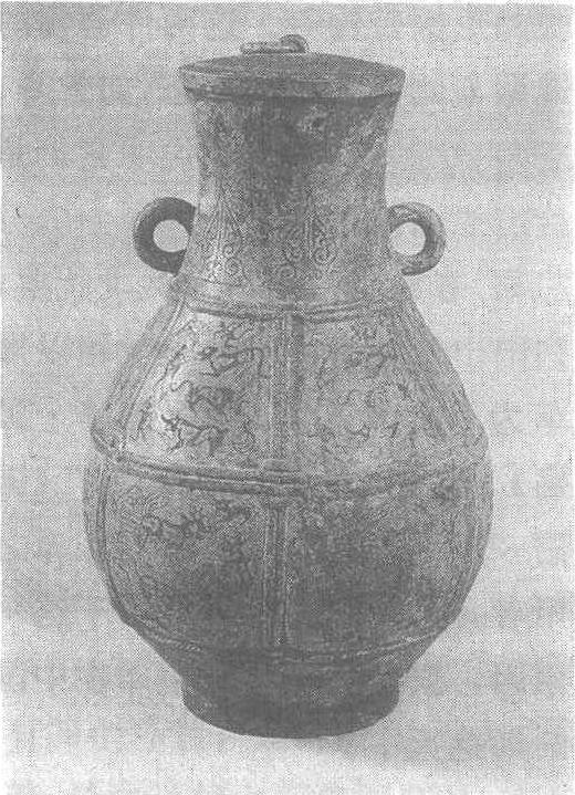 战国。通高35.2厘米,口径10.9厘米。1951年河北省唐山贾各庄出土。北京中国历史博物馆藏。此壶小口,高颈,阔腹,肩、腹无显著的分界,肩上有两个环耳,饰绳索纹。圈足。扁圆盖,盖中央有一半圆环钮,周围用红铜镶嵌一周饕餮纹。盖环钮中附有一环,两面有綯纹。颈部有六个用红铜镶嵌的三角涡纹。腹部在双重结钮绳索纹构成的12方格内饰红铜镶嵌的狩猎纹。纹饰中有人,禽,兽等图形。猎人手持长矛与兽争斗,可辨的兽有牛、象等,禽形有奔走和飞腾两种。镶嵌的纯铜呈红色,极清晰,可惜大部分已经脱离。这类铜壶的纹饰大都作宴乐、采桑、弋禽、狩猎、射箭、水陆攻战、徒兵搏斗、攻城等,是当时贵族生活和诸侯兼并战争的生动反映。从此壶的器形、纹饰及出土地点看,应是战国时燕国之器。
