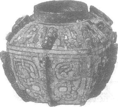 商。古代盛酒、水器。通高10.8厘米,口径5.8厘米。传1934年河南省安阳市出土。北京中国历史博物馆藏。此方罍失盖,斜肩,腹下敛,平底略凹入。肩上饰倒夔纹。四隅有扉棱,中间有小兽首。两侧兽首有孔,可穿系。腹部饰饕餮纹,上加两道弦纹,有八道扉棱。肩、腹部花纹及小兽首上皆满嵌绿松石。在青铜容器中像这样通体嵌绿松石的,极为罕见。罍肩单饰倒夔纹,也很特别。