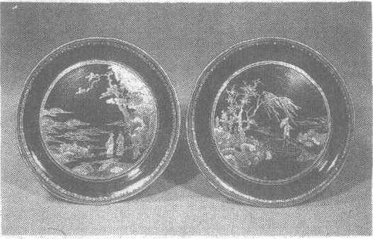 清。两件口径皆为12.3厘米。上海博物馆藏。圆形。大、小形制相同,均在黑褐色漆地上用螺钿加金银片镶嵌纹饰。其一,口沿内侧饰一圈菱形花,盘底圆形开光中,饰行人过桥图:天低云暗,岸柳狂摇,波涛汹涌的江面上,架一笈笈可危的木桥,桥上一人持伞小心翼翼地拾阶而行,风雨欲来之势赫然。其二饰水边辩论图:危岩垂耸、奇松虬展的江边,二人相对而立,辩论着什么,头挽高髻的老者背手发难,对面戴乌纱帽的小官以手抚胸,竭力申辩。不远处,侍童腋夹锦囊琴,悠然闲立。江中波起浪涌,水阔天空。漆盘虽用嵌螺钿加金银片装饰,但纹饰缜密纤细,颇具青绿山水的韵味,尤其“行人过桥图”,将风雨来临前的景象刻画得生动入微,不愧出自名流江千里一派之手。嵌螺钿见“嵌螺钿朱漆龙纹盘”条目。
