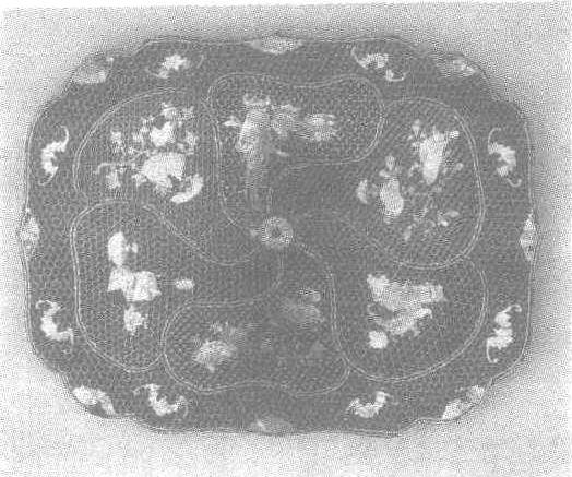 清乾隆。径22.8厘米,宽17厘米,高7厘米。北京故宫博物院藏。菱花形。子母口。盒表面黑漆地上,镶嵌各色各样的螺钿图案:盒面正中六瓣菱花形开光内,嵌不同的锦纹、博古、菊花图案,其外环围八只蝙蝠、八朵如意卷云;盒壁四个海棠花形开光,内嵌山水楼台小景,外嵌锦纹。底及盒内上下平面嵌海棠、菊花、佛手等折枝花卉。纹样繁杂,镶嵌细腻。嵌螺钿见“嵌螺钿朱漆龙纹盘”条目。