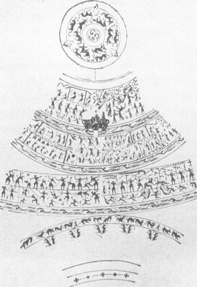 释义 | 嵌错攻战宴乐纹铜壶 嵌错攻战宴乐纹铜壶qiancuo gongzhan yanlewentonghu酒器, 1965年四川成都百花潭战国墓出土。通高40、口径13.4、腹径26.5厘米。壶通体嵌错有丰富多采的图象, 以3条带纹分为四层画面。以壶肩两耳为左右,壶前后两面图象是对称的。第一、二、三层图象又分别分为左右两组,共有6种,包括竞射、采桑、宴乐、狩猎、攻城和水战等场面。第一层左面和第二层右面上部图象为竞射场面。在右边建筑物旁设箭靶,参加竞射者皆着长裳,其中一个正在瞄准,引弓待发,一个刚刚发弦,箭在空中飞过。后面一人,一手持弓, 一手抽矢, 作接射状。下面五人, 有的回首召唤,有的持弓挟矢,作准备竞射状,姿态极为生动。第一层右面一组为采桑图象。上面有桑树两株, 枝叶茂盛。树上有人用篮采桑, 下边众人用篮运桑, 另有一人歌舞助乐,再现了当时采桑的情景。第二层左边一组为宴乐场面。一高大宽阔建筑物内, 上层人皆腰悬短剑, 一人凭几而坐, 身后有执长柄扇的侍者,面前有两人举觯进献。右面有四个佩剑者执矛作舞。下层有钟、磬、建鼓、笙、箫等演奏。第三层右面一组为水陆交战图象。人皆着齐膝战袍,有帻。分上、下两层。上层中间, 左竖一旌旗, 右竖一悬有羽旌的钩兵,表示两军阵式分明。武士分别持矛、盾、剑、戟等, 左边一人跽坐于地, 双手各持一桴, 鸣金 (丁宁)击鼓, 相对步战。下层为舟战图象, 双方均佩短剑, 呈用力摇桨冲击对方,两舟对战。从上下两层图象看,可能是陆地、水上相互配合的水陆交战。壶上六组图象生动地再现了由奴隶制向封建制转变的社会变革时期, 耕战和社会风貌。 嵌错攻战宴乐铜壶纹饰 ☚ 曾侯乙墓编钟 诸子百家 ☛ |