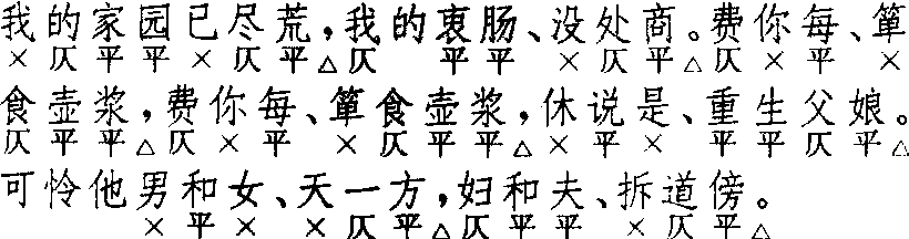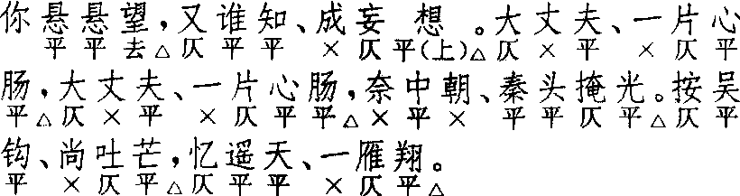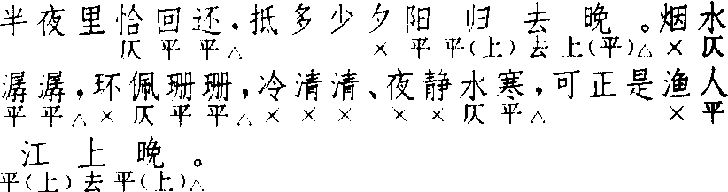 释义 | 川拨棹 川拨棹金人杰 《追韩信》 ![]() 全曲六句:3△,5△。4△,4△,7△,5△。首句常加衬字作六字折腰句。第五句有叶上声韵以至去声韵者。第五句偶有省去上三字而作四字句者,如关汉卿《鲁斋郎》。末句可作六字折腰句;或破为两个三字句,如马致远《任风子》“可不道家有老敬老,家有小敬小”。此章可增句,增句格式有三:一、第四句下增四字句,常见的增一句或二句,马致远《汉宫秋》增六句,句式同第三、四句;二、末句后增六字折腰句,常见者增一句,关汉卿(?)《裴度还带》增三句;三、混合式,如杨景贤《西游记》第四出,四字句、六字折腰句各增一句。〔川拨棹〕例接〔七弟兄〕、〔梅花酒〕、〔收江南〕,不用〔川拨棹〕者极少。〔太清歌〕必接用〔川拨棹〕。亦可单用。与南曲不同。 ☚ 太平令 七弟兄 ☛ 川拨棹 川拨棹冯梦龙 《精忠旗》 ![]() 前腔 换头 前人 ![]() 正格七句:3△,6△。7△,叠7△,7△。6△,6△。换头格七句:7△,6△。7△,叠7△,7△。6△,6△。换头格首句改七字句,下同。第三、四两句须用叠句。第六、七两句亦可用叠句。连用二支时,第二支可不用换头,如《绣襦记·堕计销魂》、《红梅记·脱难》。换头第二句为六字折腰句,与正格同,《琵琶记·南浦嘱别》换头首二句作“我的埋冤怎尽言,我的一身难上难”,第二句“的”字作衬字处理,故仍为六字;但后来作者有径作普通七字诗句者,如《浣纱记·送饯》、《昙花记·辞家访道》、《玉合记·投合》等。首二句有均作六字折腰句者,如《绣襦记·堕计销魂》二支、又《剔目劝学》一支、《琴心记·阳关送别》第一支。《西厢记·佛殿奇逢》二支,第一支首二句均作六字折腰句,第二支换头第二句叠,以及不合律之处,《南音三籁》卷四“戏曲下”收录此套,已作了一些技术性处理。同样,《牡丹亭·寻梦》三支,每支均有不合律处,后来曲谱及有些刻本作了润改,参看钱南扬校本。第三、四两叠句有不叶韵者,如《西厢记 ·佛殿奇逢》第一支、《娇红记·泣舟》三支。〔川拨棹〕联套时常用一支或二支,都用在套数末尾,尾声之前。叠用二支或三支成套,只见于《荆钗记·觅真》和《拜月亭 ·抱恙离鸾》,后来少见。《清忠谱·就逮》一支缺题牌名。与北曲不同。〔川拨棹〕早见用于《张协状元》第四十五出,词式颇简。《白兔记·送子》二支、《荆钗记》“分别”、“觅真”、“夜香”三出共四支,皆长短不一致。《杀狗记· 王老谏主》一支、《拜月亭 ·抱恙离鸾》三支始定型。曲谱皆取《琵琶记·南浦嘱别》二支为词式,并补足第三句后的叠句。以〔川拨棹〕为主的集曲有〔拨棹入江水〕、〔拨棹带侥侥〕、〔拨棹供养〕,见《南词简谱》。 ☚ 玉抱肚 嘉庆子 ☛ 川拨棹 川拨棹见金王喆《重阳全真集》卷四。唐教坊曲有《拨棹子》,盖船夫曲,入宋则用以唱道。吴曾《能改斋漫录》卷二云:“京师僧念《梁州》、《八相》、《太常引》、《三皈依》、《柳含烟》等,号‘唐赞’。而南方释子作《渔父》、《拨棹子》、《渔家傲》、《千秋岁》唱道之辞。”王喆曾于山东聚徒讲道,其词意在惩恶劝善,名以《川拨棹》者,或寓普渡众生之意,犹存宋人唱道之风。双调,七十字,上片七句三仄韵又一叠韵,下片六句四仄韵又一叠韵。上、下片结句均重叠上句。又,王喆《重阳教化集》卷一另有《川拨棹》七首,体格与上述者分明不同。其词属联章体,首尾两首一起一结,中间五首分别以“一更里”、“二更里”、“五更里”等领起;上片结句均为“玉花结”;下片结句均为“害风儿,怎生说”。中间五首字句一致,均双调,六十字,上片六句三仄韵,下片六句四仄韵。首尾两首体格与中间五首相近,唯句度略有参差。此调《词律》、《词谱》均不载,此依《全金元词》。 ☚ 千秋岁令 个侬 ☛ |