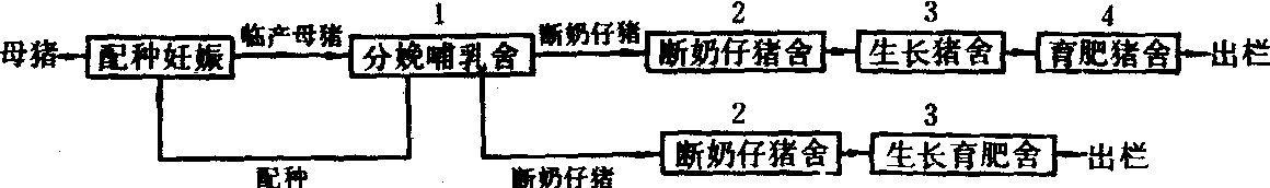 注:1.表中占地面积不包括独立饲料厂。2.生产建筑面积系按漏缝地板母猪单栏饲养计算,如采用实体地面或母猪群养,建筑面积可增加10%。 饲养工艺 工厂化养猪场的生猪从出生到出栏约需180天左右,经历配种、分娩、保育、生长、育成、育肥、出栏等环节。饲养工艺流程最常见的是分为四阶段(哺乳猪→仔猪→生长猪→育肥猪)或三个阶段(哺乳猪→仔猪→生长育肥猪),其流程见图。 猪的饲养工艺流程 四阶段饲养较三阶段饲养可提高猪栏利用率,减少猪舍面积,但要多转群一次,劳力消耗增加,对猪的生长也有一定影响。此外,按栏养方式可分为单栏饲养和小群饲养。单栏饲养又可分为限位饲养和散放饲养;按猪栏形式可分为地面栏养和网上栏养(离地约60厘米)等等。 设备 工厂化养猪场根据规模,机械化程度等不同条件,配置或部分配置以下设备:场区动力能源设备,如变电、发电、锅炉房等;场区运输设备,如饲料罐车、饲料运送机和其他运输车辆;卫生防疫设备,如淋浴消毒、医疗防疫器械、病死猪无害化处理设备;污水粪便处理设备;场区其他专用设备,如泵站、饲料塔、饲料加工、称量设备等,以及猪舍内的设备。 |