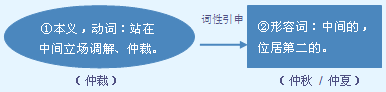 zhòng ❶名〈文〉兄弟排行中的老二。伯仲叔季|仲兄(二哥) →❷名指一季里的第二个月。仲夏|仲秋 ❸ 形 位置居中的。仲裁 ○❹名姓。