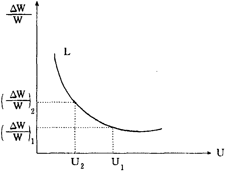 新西兰经济学家菲利普斯于1958年在英国伦敦经济学院任教时提出,用来表示失业率和工资变动率之间替换关系的曲线。菲利普斯依据1861—1957年近一个世纪中英国失业率和货币工资变化率的关系作了一条曲线,见下图。图中纵轴表示货币工资增长率,横轴表示失业率。曲线L为菲利普斯曲线。这一曲线所表明的是,当失业率由OU1下降到OU2时,货币工资增长率就由(ΔW/W)1上升到(ΔW/W)2。由于货币工资的变动率与物价上涨率有关,而通货膨胀率又用物价上涨率表示,因此,上图的纵轴也可表示通货膨胀率。这样,后来的经济学家就把通货膨胀率与失业率之间的关系用菲利普斯曲线来表示。菲利普斯曲线表明,失业率和通货膨胀之间存在着稳定的反比例关系,政府的通货膨胀政策是降低失业率的一个有效手段。但70年代后,由于西方国家滞胀的出现,菲利普斯曲线开始失效。围绕着菲利普斯曲线,西方经济学家进行了长期的争论,争论的结果也推动了西方宏观经济学的发展。