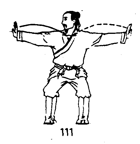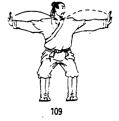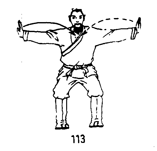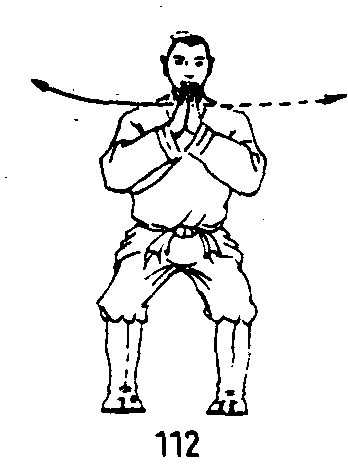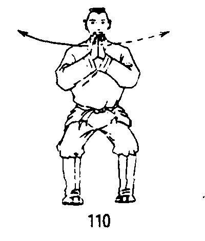 四十九式经络动功第3段“导气”动作之四(全套动作顺序第二十六式):❶随着吸气,提肛调裆;两腿半蹲不动;同时两臂内旋两掌从小指依次相抵分开使掌心慢慢转向体侧时再推出,两臂伸直;眼看左掌。(图109)❷随着呼气,松腹松肛;两腿半蹲不动;同时两掌从体侧合于面前成“童子拜佛”势;眼看指尖。(图110)❸拍同❶拍,唯向右转头做动作。(图111)❹拍同❷拍。(图112)❺两脚仍不动,头亦不动,两掌同上再向左右推出。(图113)练功次数:“童子拜佛”和“左右推碑”连在一起各做3次,一拜一推为一次。要点:“童子拜佛”和“左右推碑”要连在一起进行;左右推碑应以意引气沿肺经循行至拇指和食指尖;由推碑还原成拜佛势时应以意引气沿大肠经循行至肺脏入属大肠。